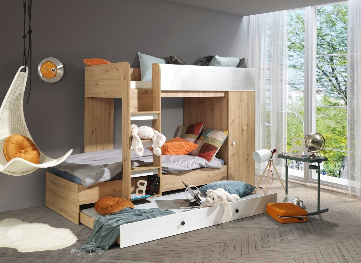 Modernes Hochbett mit 2 bis 3 Schlafflächen und 1 Schrank. Eignet sich sehr für kleinere Kinderzimmer.