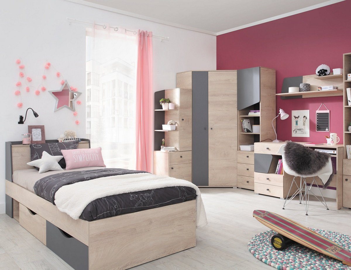 Ausführung | Eckschrank, 2 Regale, Schreibtisch, Wandregal, Bett 200x90 |