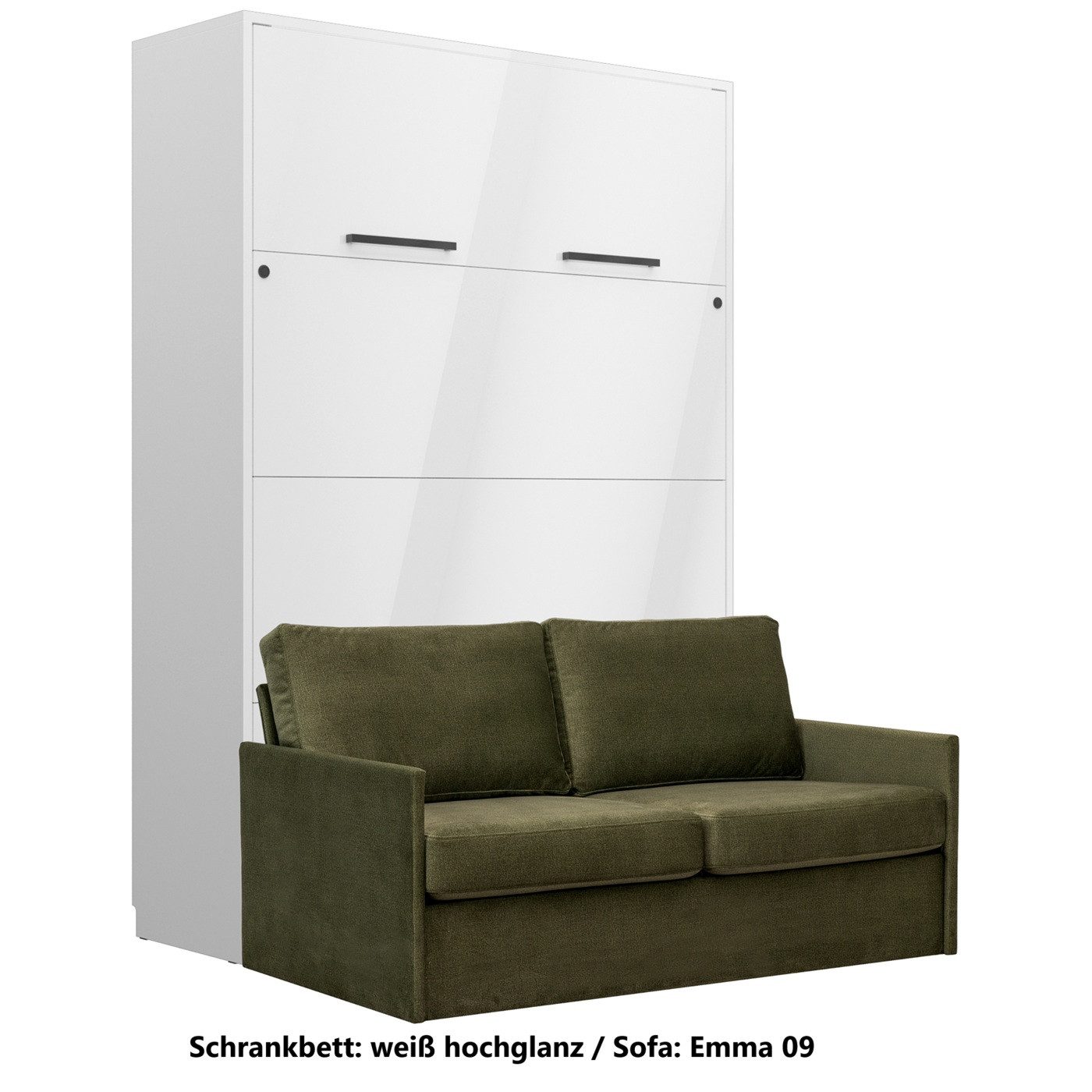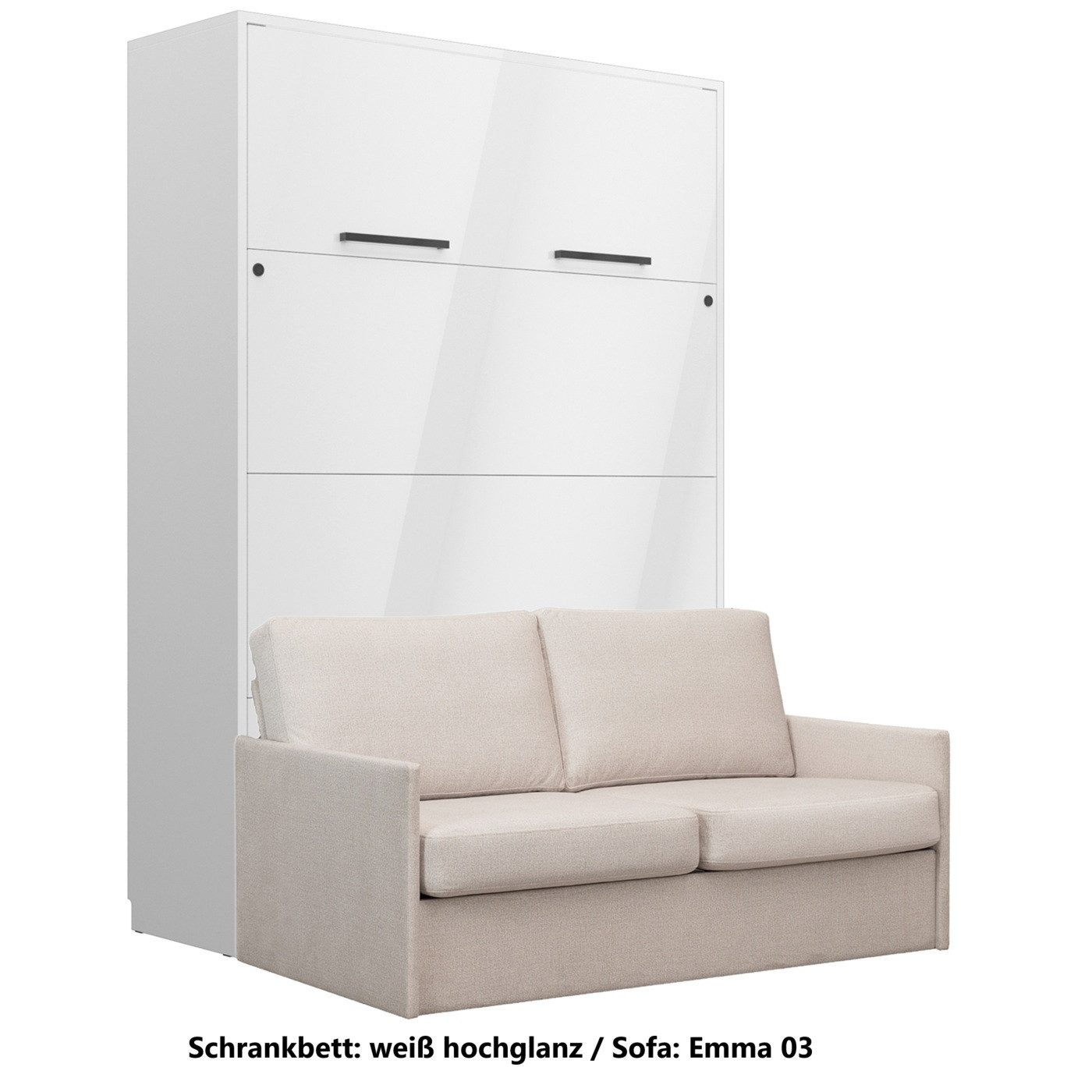 • Vertikales Schrankbett 140x200cm mit Fronten in weiß hochglanz, mit LED & Sofa in 5 Farben zur Auswahl – kostenlose Stoffproben vom Sofa verfügbar!