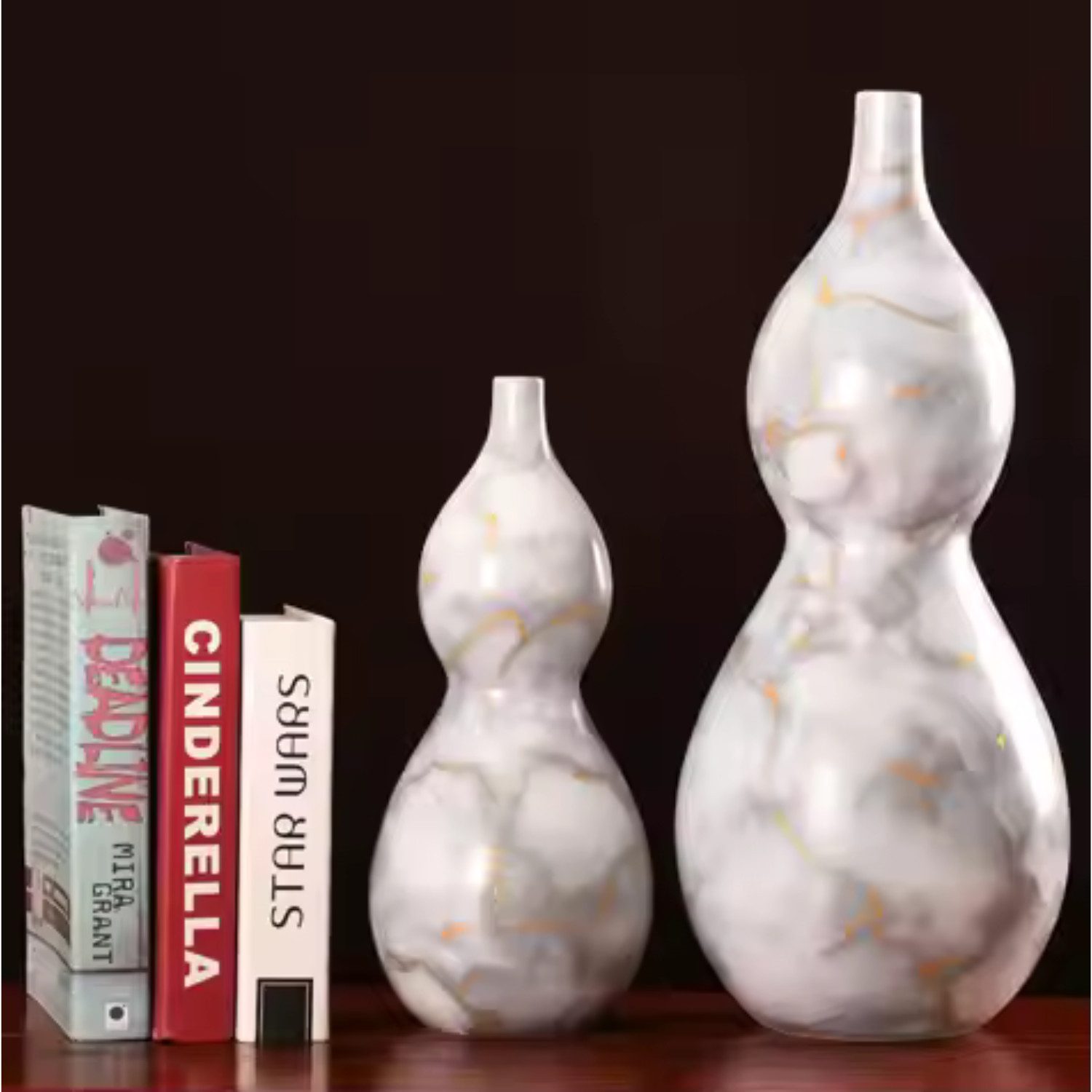 Dieses stilvolle 2er-Set aus Keramikvasen verbindet modernes Design mit luxuriösen Akzenten. Die edle Marmoroptik in Grau mit goldenen Highlights und die elegante Kürbisform machen die Vasen zu einem zeitgemäßen Highlight für jedes Interieur. Ideal für frische Blumen, Trockensträuße oder als dekorative Skulpturen – ob auf dem Sideboard, Couchtisch oder im Flur. Das Set verleiht jedem Raum eine stilvolle Note mit zeitloser Eleganz.