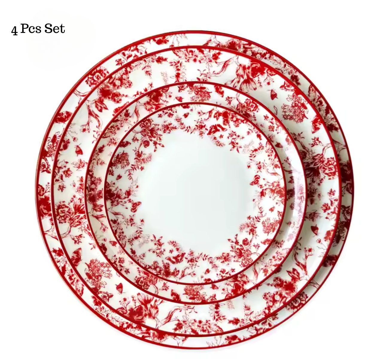 Ein ausdrucksstarkes Design für eindrucksvolle Tischmomente: Das Luxury Red Floral Dinner Set vereint kunstvolle florale Muster in leuchtendem Rot mit der edlen Transparenz von Fine Bone China. Ob für festliche Anlässe, ein stilvolles Abendessen oder als besonderes Geschenk – dieses Set bringt Farbe und Klasse auf den Tisch. Gefertigt aus 43 % Knochenmehl (Knochenasche) und hochwertiger Keramik, verbindet es elegante Optik mit langlebiger Qualität. Set-Bestandteile: 1 × Charger-Platte (30,5 cm) 1 × Speiseteller (26,5 cm) 1 × Dessertteller (20,5 cm) 1 × Brotteller (16,5 cm)
