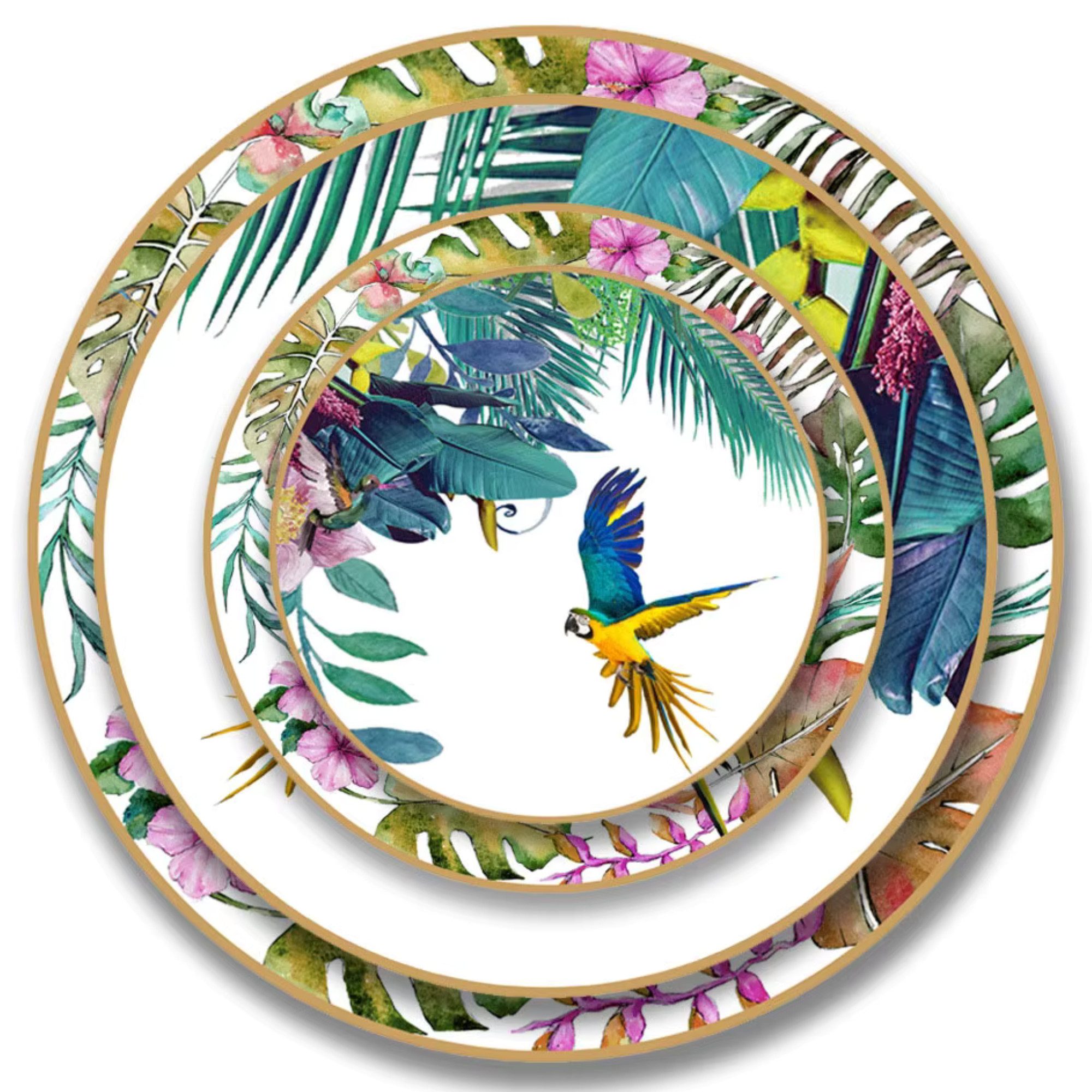 Exquisites Tropen-Design – Detailreiche, farbenfrohe Muster machen das Set zum Blickfang auf jedem Tisch.