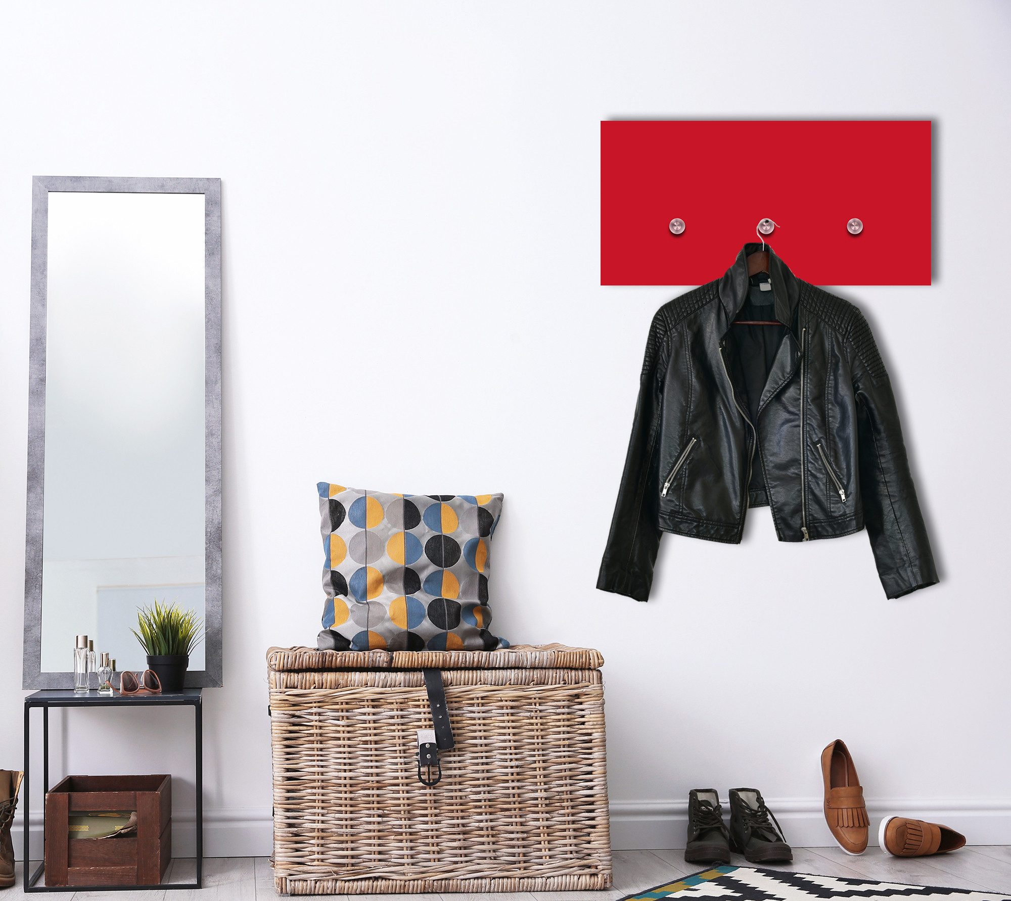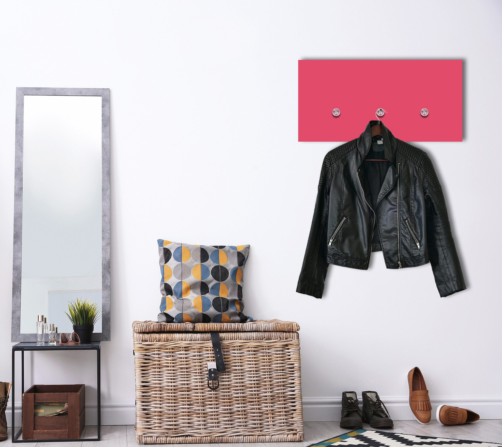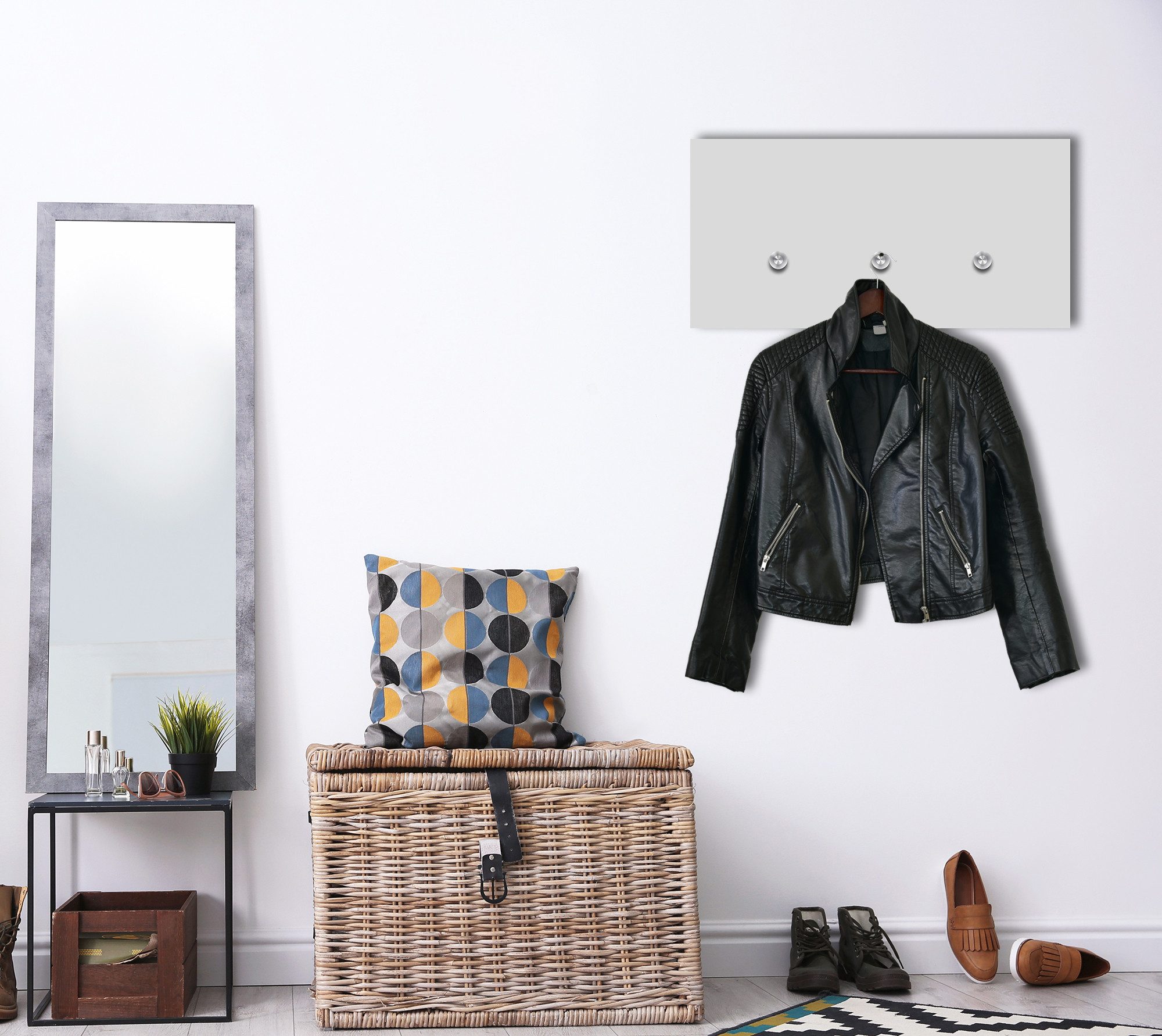 Eine Wandgarderobe der besonderen Art! Den ersten Raum, den Sie beim Betreten Ihrer Wohnung wahrnehmen, ist Ihre Diele. Grund genug, viel Liebe und Zeit in die Gestaltung des Eingangsbereiches zu investieren. Zu einer vollständigen Flureinrichtung gehört natürlich auch eine schöne und praktische Wandgarderobe, an der Sie und Ihre Gäste Jacken aufhängen können. Mit unserer angesagten Wandgarderobe verleihen Sie Ihrer Diele einen modernen und stylischen Chic. Unsere Wandgarderoben aus Acrylglas gibt es mit verschiedenen Motiven. Sie verfügen über Design-Kleiderhaken aus Edelstahl - perfekt, wenn Sie viel Platz benötigen oder häufig Gäste zu sich nach Hause einladen. Die oberen Haken bieten genug Platz für Jacken und Mäntel. Die unteren Haken sind perfekt geeignet, damit z.B. auch Kinder diese für ihre Jacken nutzen können. Möchten Sie ihren Flur oder natürlich auch andere Räume optisch noch mehr aufwerten, dann ist unsere außergewöhnliche Designer Garderobe genau das Richtige für sie. Denn gut getarnt ist diese Garderobe auf den ersten Blick gar nicht als solche erkennbar. Vielmehr bewundert man das farbenfrohe und moderne Motiv an der Wand und erst auf den zweiten Blick fallen die Haken im oberen und unteren Bereich auf, welche das Bild als Garderobe entlarven. Bitte verwenden Sie 2 Distanzringe pro Schraube und ziehen diese mit einem Werkzeug fest! Wir verbinden praktisches mit geschmackvollem Design. Dank der riesigen Motivauswahl passen unsere Garderoben perfekt in jeden Raum. queence - so geht wohnen heute