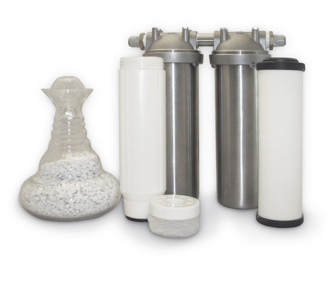 Der Weiß Marmor Durchflussfilter enthält natürliche Marmorkiesel durch die das Leitungswasser im ersten Filtergehäuse fließt und wie Gebirgswasser belebend- erfrischend wird.