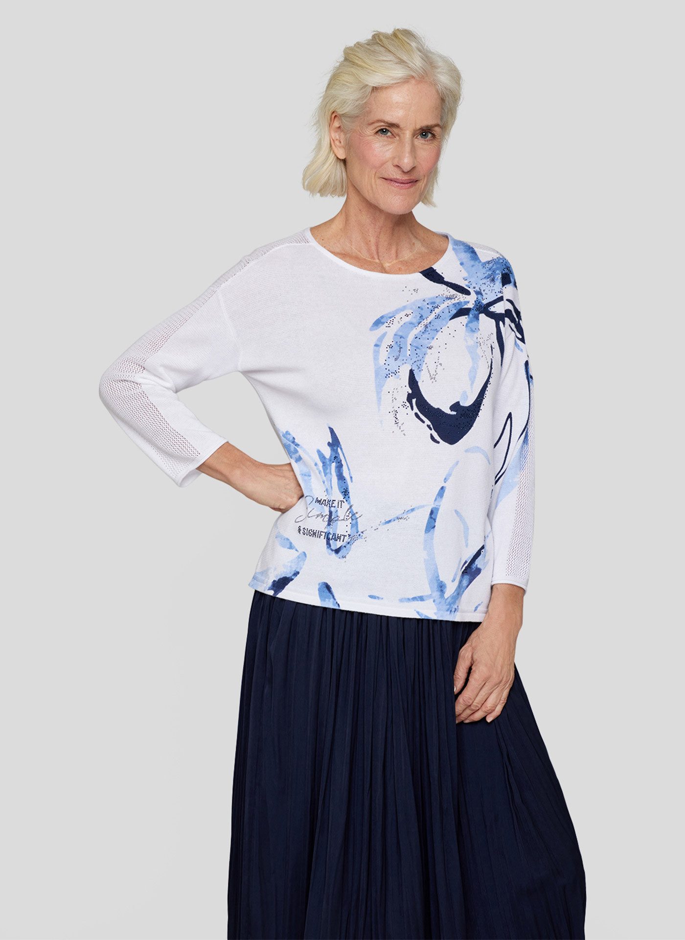 Dieser 1/2-Arm-Pullover von RABE kombiniert kreatives Design mit hohem Tragekomfort.Der florale Print in künstlerischer Optik wird durch den strukturierten Stoff besonders effektvoll in Szene gesetzt.Ein idealer Begleiter für die Übergangszeit – ob im Alltag, beim Stadtbummel oder im Büro.Floraler Frontprint mit modernen Schriftzügen.Strukturstrick-Qualität für eine besondere Optik und Haptik.1/2-Ärmel – perfekt für Frühling oder Sommertage.Klassischer Rundhalsausschnitt für eine feminine Silhouette.Angenehmes Material mit bequemem Sitz. Bitte beachten Sie, dass dieser Artikel mit 1/2-Arm geliefert wird.