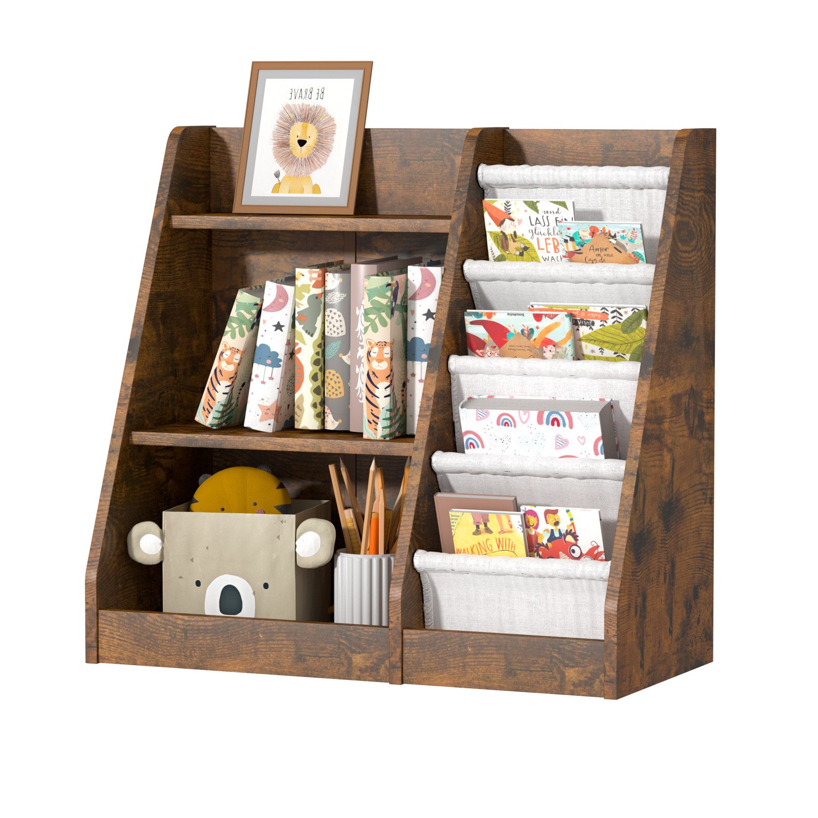 • 4 Schlingentaschen-Dieses Bücherregal mit Schlingentaschen zur Aufbewahrung von Büchern zeigt die Bücher mit dem Einband nach vorne, damit Kindern leicht erkannt werden können.