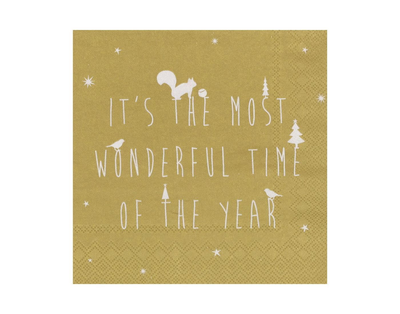 Goldene Papierservietten mit winterlichen Motiven für die Weihnachtszeit.
