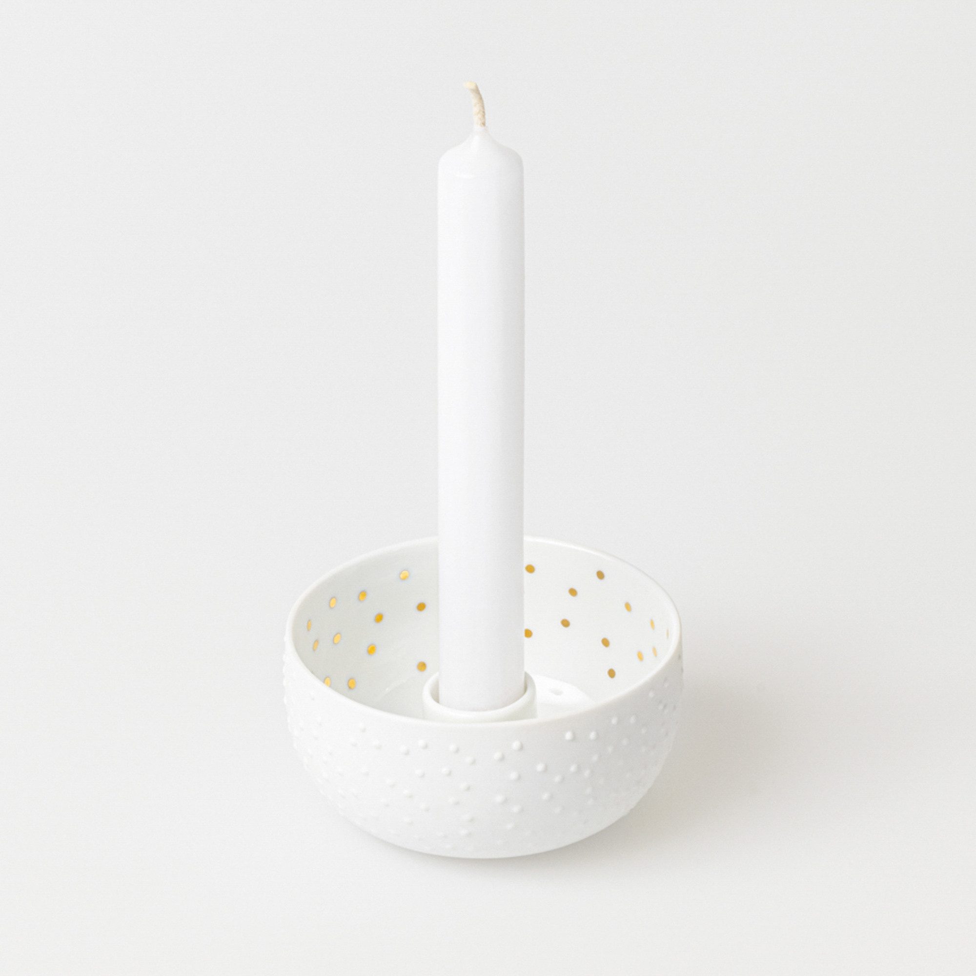 Der räder Punkte Kerzenständer präsentiert sich in einem klaren, modernen Look, der durch das zarte Relief auf unglasiertem Porzellan besonders zur Geltung kommt. Das zurückhaltende Weiß fügt sich harmonisch in unterschiedliche Wohnstile ein und sorgt für eine ruhige, elegante Atmosphäre. Ideal als dekoratives Einzelstück oder in Kombination mit weiteren Accessoires.