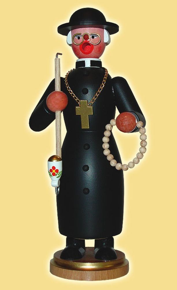 Räuchermann Katholischer Priester Der tolle Räuchermann hat eine Размер von 23 cm. Die Figur steht frei auf einem Sockel und hat eine Funktion für normale Räucherkerzen. Katholische Priester trägt seinen langen schwarzen Talar und hält in der Hand vor sich seine Pfeife mit einem bunten Pfeifenkopf in der anderen Hand hält er den Rosenkranz. Auf dem Kopf trägt er einen schwarzen Hut und um den Hals hängt eine Kette mit einem goldenen Kreuz. Der Räuchermann ist komplett aus Holz gefertigt und bunt gestaltet. Das Unterteil mit dem Boden läßt sich abnehmen und darauf wird die Räucherkerze gestellt. Всеs wird in verschiedenen Arbeitsschritten komplett in Seiffen in einem Familienbetrieb mit langer Tradition gefertigt Höhe= 23cm NEU |