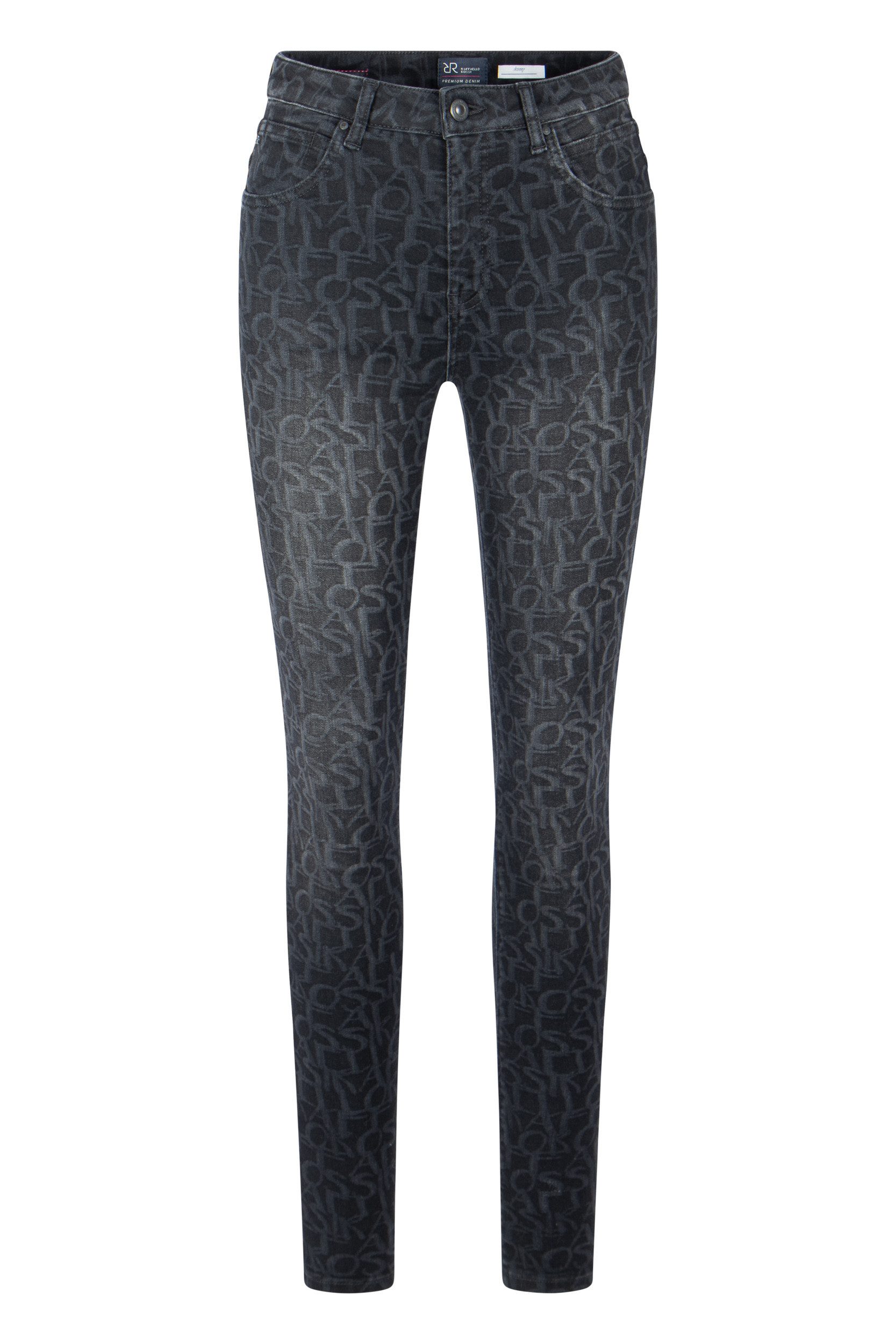 Diese sportlich-elegante Highwaist Slim Jeans sorgt für ein perfektes Figur-Shaping. Sie hat schmale Beine, raffiniert gearbeitete Coin Pocket und eine doppelte Sattelnaht hinten. Der Muster mit All Over Raffaello Rossi Schriftzug macht die Jeans zu etwas ganz Besonderen.