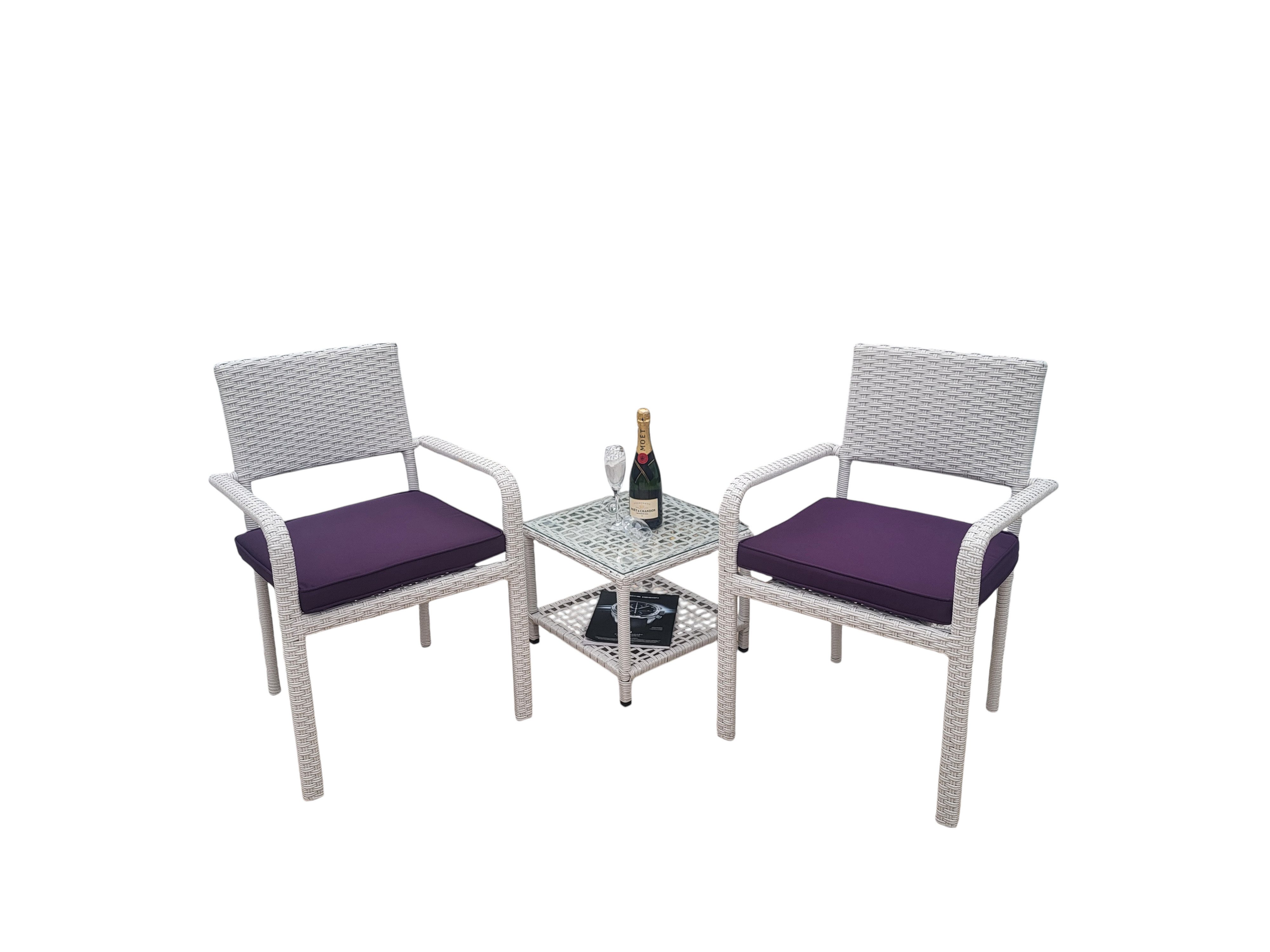 Lieferumfang | 2 Stühle inkl. 2 Polster 1 Tisch inkl. 1 ESG Sicherheitsglasplatte |