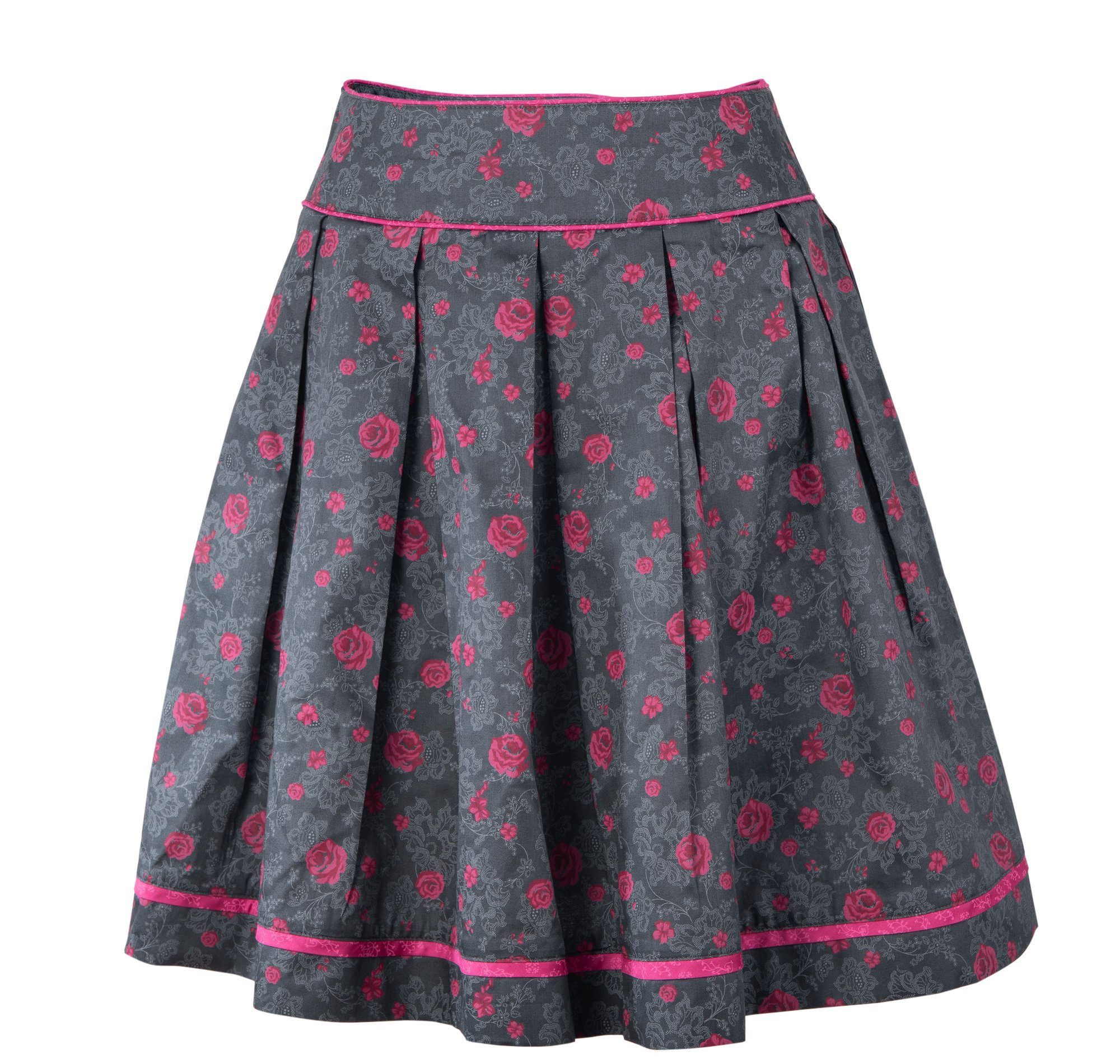 Der dunkelgraue Stoff mit pinken Rosenmuster verleiht dem Rock eine feminine und elegante Note.