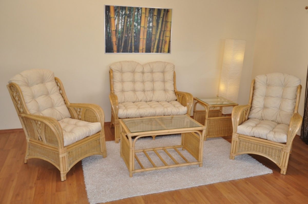 Komplettes Set bestehend aus 2 großen Rattansessel , Rattan Zweisitzer , Rattantisch und Beistelltisch .