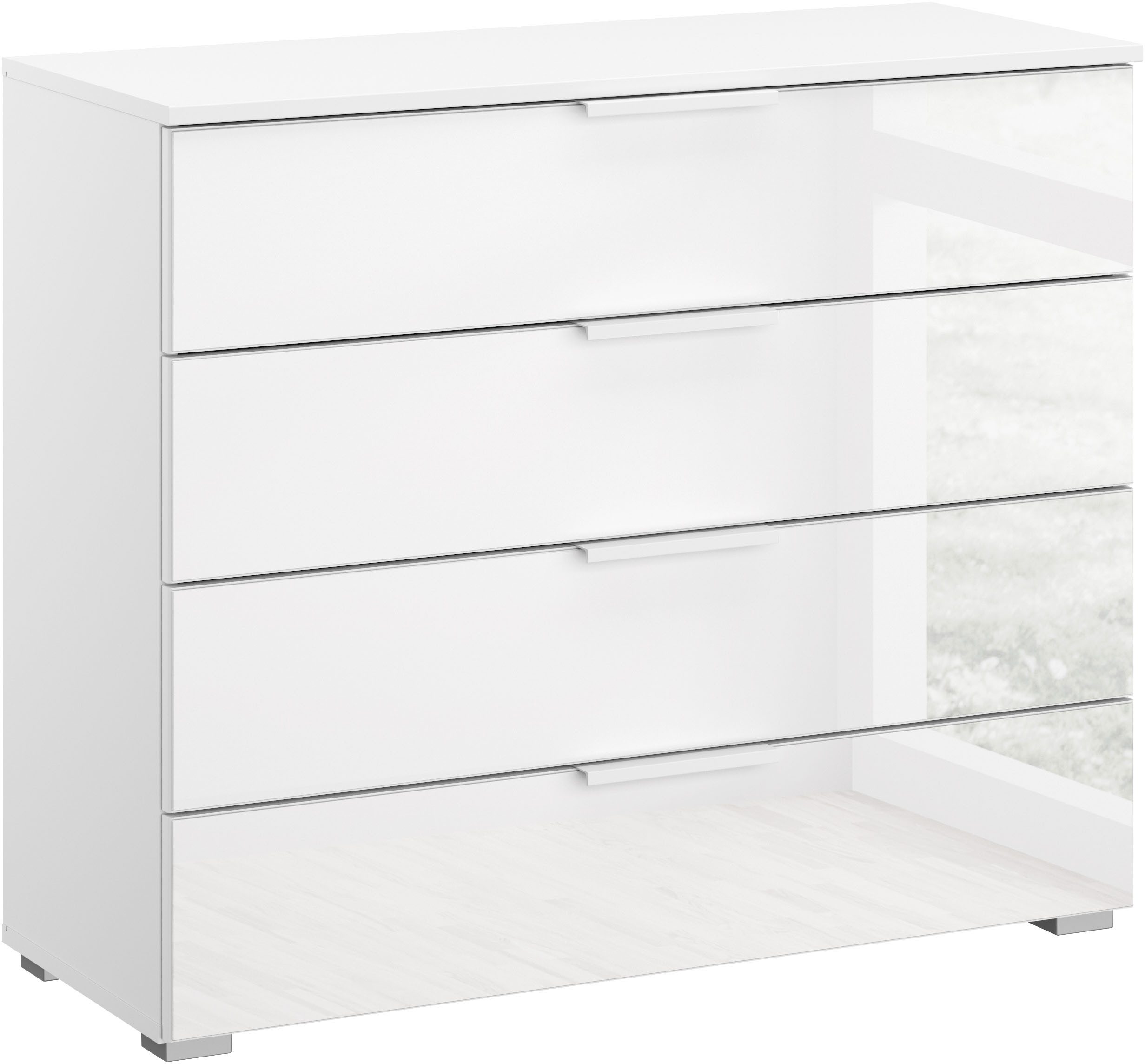 Die Schubkastenkommode »KOLUNA« von rauch ist ein wahrer Stauraum-Allrounder und lässt sich dank seiner modernen Farbauswahl mit Glasfront in jedem Raum deines Zuhauses integrieren. Der praktische Ordnungshelfer unterstützt dich so im Schlafzimmer, Wohnzimmer, Flur oder auch Büro deine persönlichen Gegenstände zu organisieren. Auf der oberen Ablagefläche kannst du deine Dekoration gekonnt in Szene setzen. Die vier Schubladen öffnest du mit minimalistischen Griffen und hast so den Inhalt direkt auf einen Blick. Optional kann die Kommode durch einen farblich abgestimmten Kleiderschrank, Bett oder Nachttisch ergänzt werden.