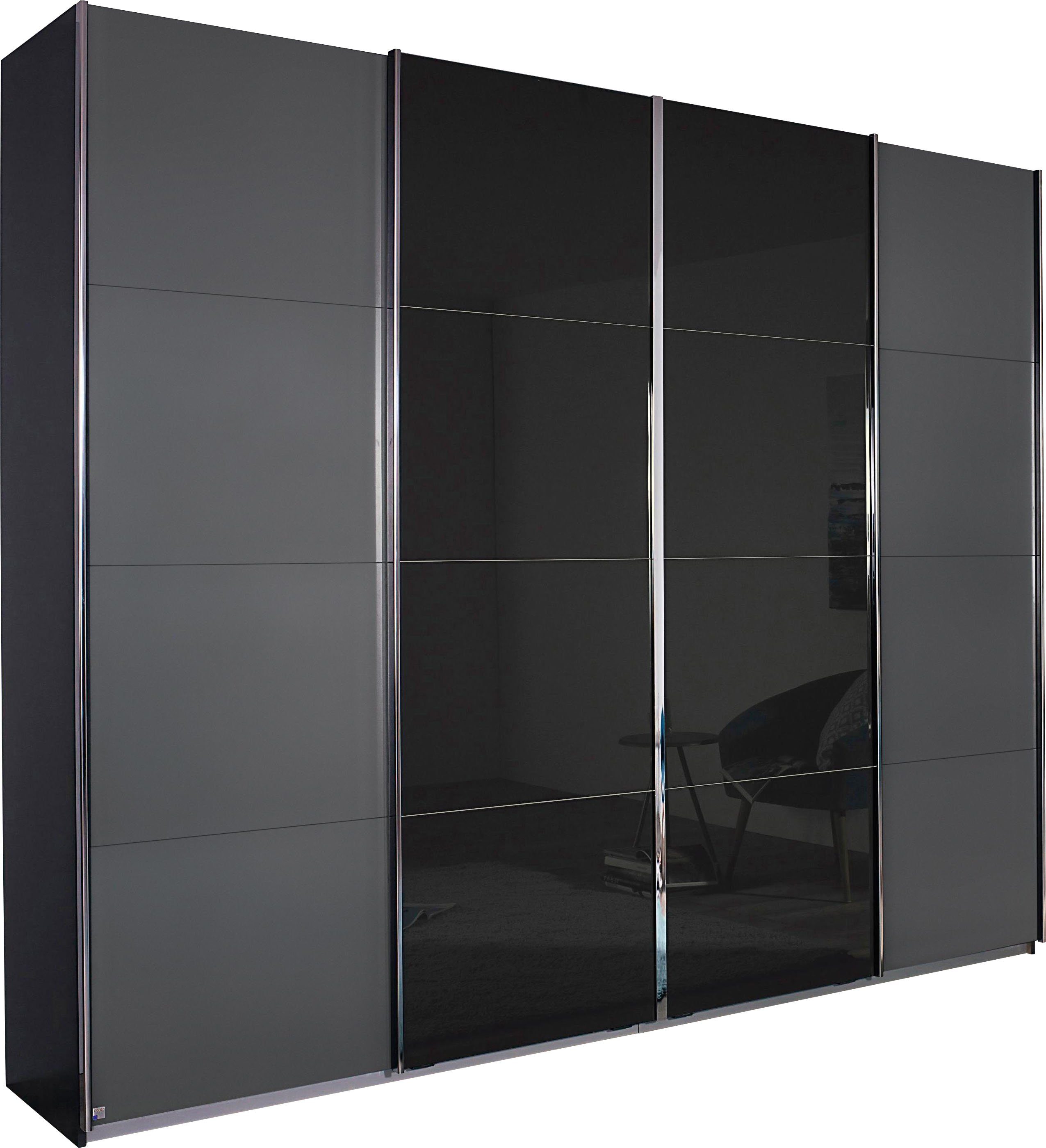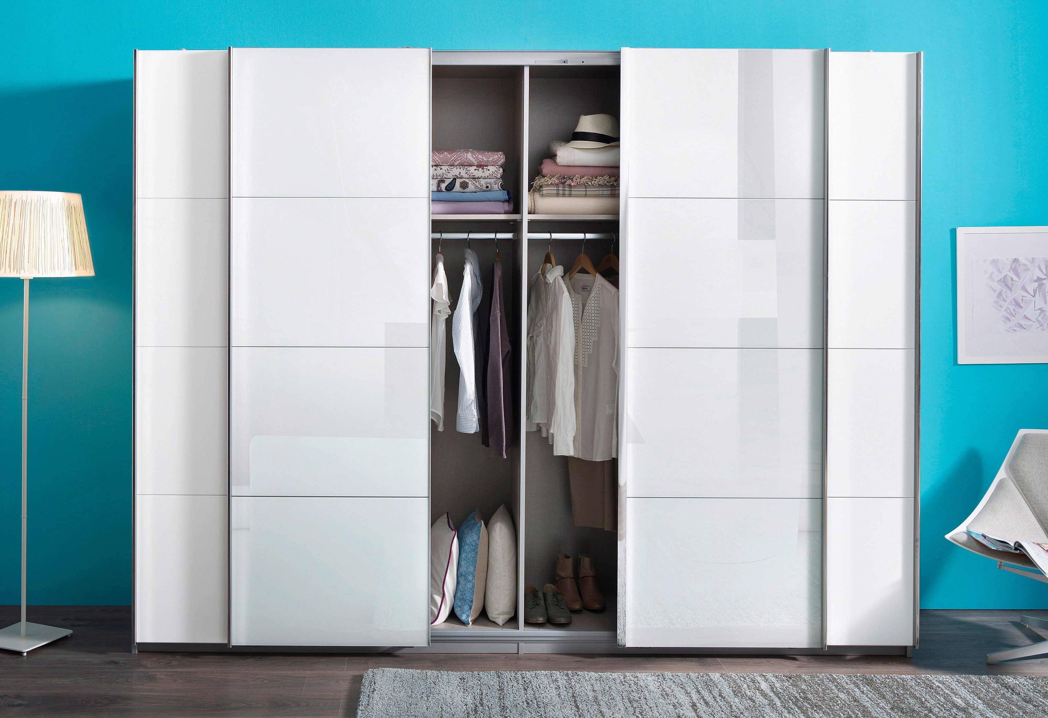 Wissenswertes | Fronttüren mit farbigen Glasauflagen Innendekor in heller Leinenoptik. Inneneinteilung pro Fach mit jeweils 1 Einlegeboden und 1 Kleiderstange, siehe Piktogramme Korpus: Pflegeleichte Oberfläche. Mit komfortabler Syncronöffnung der Mitteltüren: sie werden gleichzeitig geöffnet und der Blick ist frei auf den großzügigen Stauraum im Schrankinneren |