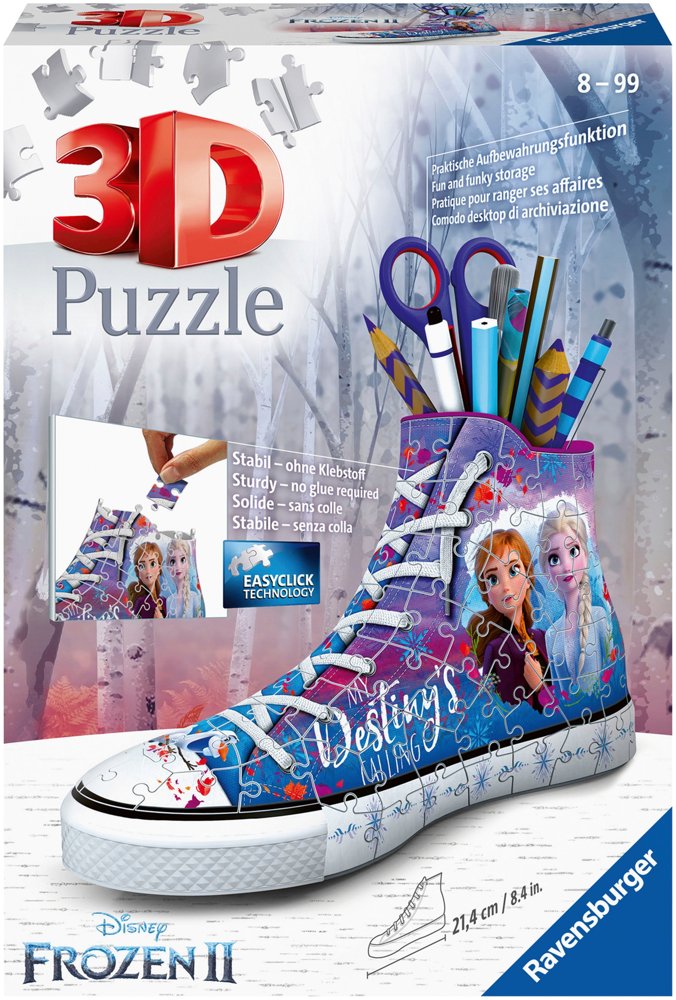 3D Puzzlespaß mit Wow-Effekt! Cooler Style, tolles Design und ein spannendes Innenleben. Der stylische Sneaker im zauberhaften Frozen-Design ist nicht nur ein optischer Blickfang in jedem Kinderzimmer, sondern bietet auch reichlich Platz für wichtige Accessoires. Endlich ein 3D Puzzle, das nicht nur Puzzlespaß bietet, sondern nach dem erfolgreichen Zusammensetzen gute Dienste leistet: Denn die 108 nummerierten Kunststoff-Puzzleteile und die perfekt passenden Zubehörteile werden zum praktischen Aufbewahrungs-Sneaker. Für Stifte, Bastelsachen oder alles andere, das zu schade ist, um einfach nur herumzuliegen. Zwar ist ein bisschen Puzzle-Geschick vonnöten, den Sneaker zusammenzusetzen, aber mit der ausführlichen Anleitung und den kleinen Nummern, die auf den teils gewölbten Puzzleteilen zu finden sind, ist das Puzzeln schnell geschafft. Und schon enststeht einen neuer Blickfang mit reichlich Platz für Utensilien aller Art. Dekoration nicht im Produkt enthalten.