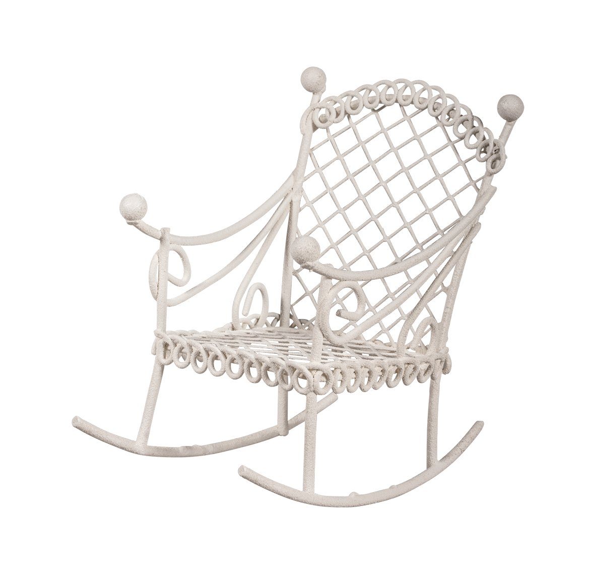 Mini-Schaukelstuhl aus Metall. Die Maße des Stuhls betragen ca. 5,3 cm Breite, ca. 8 cm Höhe und ca. 7,5 cm Tiefe.