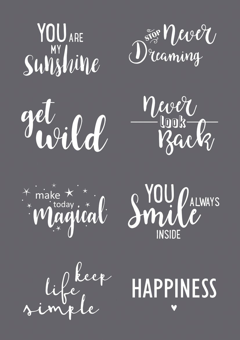 Selbstklebende, wiederverwendbare Schablone „Sprüche“ im DIN A5 Format und acht englischen Sprüchen. Hochwertige Siebdruck-Schablone mit einem sehr feinen, weichen Gewebe. Die Motivgröße beträgt ca. 5,2 bis 5,7 cm. Mit der beiliegenden Rakel können die Sprüche auf verschiedene Oberflächen wie Holz, Papier, Terrakotta, Beton und Textilien aufgetragen werden.