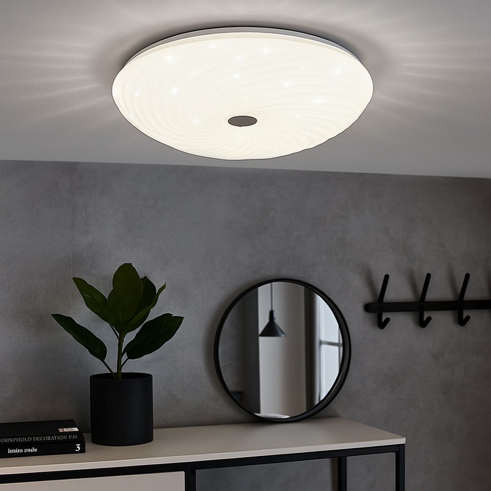 Das runde Gehäuse aus Metall und Kunststoff in Weiß wird durch einen sanft schimmernden Sterneneffekt ergänzt, der für eine dekorative Lichtwirkung sorgt. Die integrierte CCT-Funktion erlaubt es, die Lichtfarbe stufenlos zwischen 2700 K (warmweiß) und 6500 K (tageslichtweiß) einzustellen. Mit der beiliegenden Fernbedienung können sowohl Farbtemperatur als auch Helligkeit flexibel angepasst werden. Die Memory-Funktion speichert die letzte Einstellung, sodass beim erneuten Einschalten automatisch die bevorzugte Lichtstimmung wiederhergestellt wird. Dank der fest verbauten LED-Technologie überzeugt die Leuchte mit einer hohen Lichtausbeute von 5300 Lumen bei nur 45 W Leistungsaufnahme.