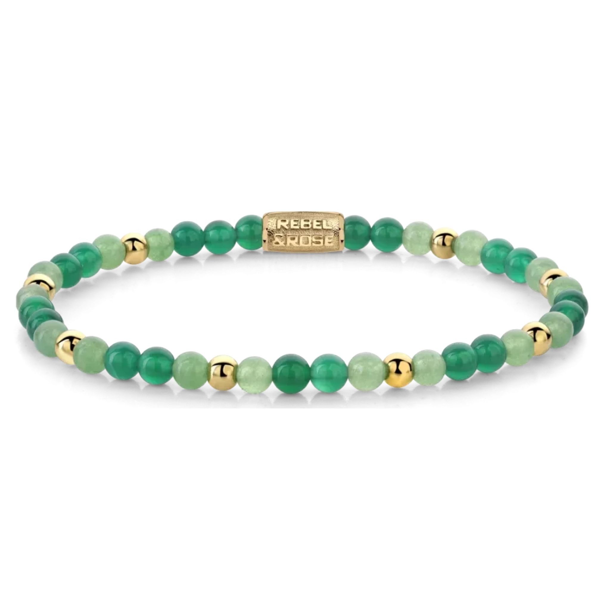 Das Rebel&Rose Armband RR-40122-G-M ist ein elegantes Damenarmband, das natürliche Schönheit und modernen Chic harmonisch vereint. Gefertigt aus 4 mm großen Aventurin- und Moosachat-Edelsteinen, begeistert es durch seine facettenreichen Grüntöne, die für Vitalität, Harmonie und eine erfrischende Ausstrahlung stehen. Ergänzt werden die Natursteine durch goldfarbene Edelsteine, die funkelnde Akzente setzen und dem Armband eine luxuriöse Note verleihen. Ein robuster Edelstahlverschluss sorgt für sicheren Halt und unterstreicht die hochwertige Verarbeitung. Mit einem Handgelenksumfang von ca. 17,5 cm passt dieses Modell perfekt für die meisten Damen und bietet hohen Tragekomfort.