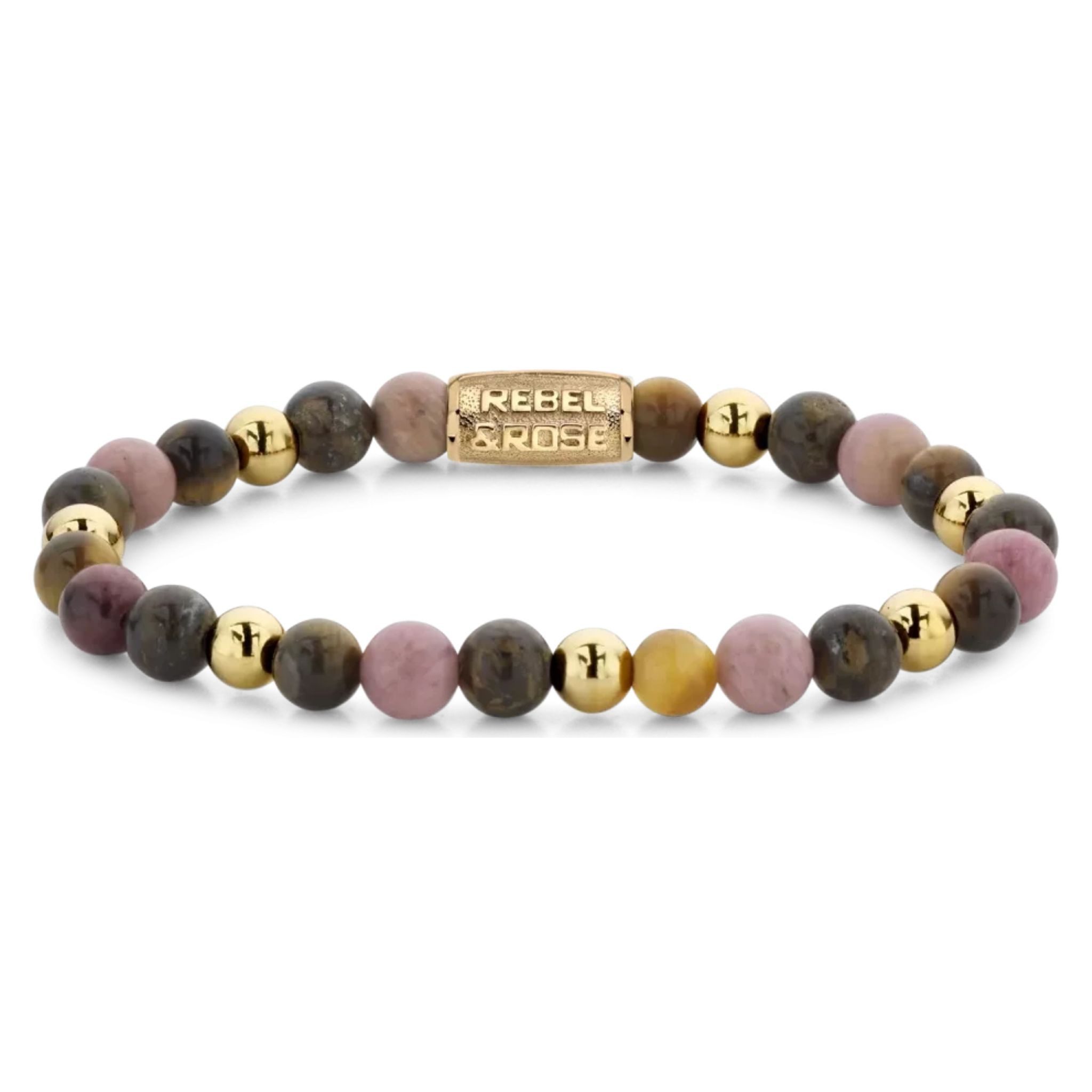 Das Rebel&Rose Armband RR-60060-G-S ist ein elegantes Damenarmband, das durch seine warme Farbkomposition und die Verwendung edler Natursteine überzeugt. Gefertigt aus 6 mm großen Edelsteinen wie gelbem Tigerauge, Rhodochrosit und braunem Bronzit, vereint es harmonische Töne von Braun, Lila und Gold zu einem ausdrucksstarken Schmuckstück. Jeder Stein besitzt eine natürliche Maserung, wodurch jedes Armband ein einzigartiges Unikat ist. Der Verschluss aus ionenplattiertem Edelstahl sorgt für sicheren Halt und rundet das Design durch seine moderne Optik stilvoll ab. Mit einem Handgelenksumfang von ca. 16,5 cm ist dieses Modell speziell für Damen mit schmaleren Handgelenken konzipiert und bietet hohen Tragekomfort.