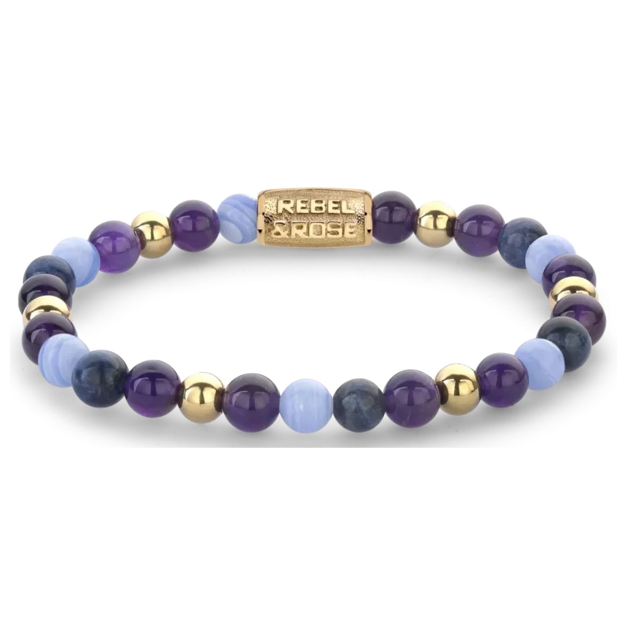 Das Rebel&Rose Armband RR-60109-G-S ist ein elegantes Damenarmband, das mit seiner edlen Farbkombination aus Lila- und Goldtönen sofort ins Auge fällt. Gefertigt aus 6 mm großen Edelsteinen – Amethyst, Sodalith und Achat – vereint es die natürliche Schönheit hochwertiger Steine mit einem luxuriösen Design. Die feinen Lilatöne des Amethyst, die tiefblauen Akzente des Sodaliths und die klaren Strukturen des Achats schaffen ein harmonisches Farbspiel, das durch goldplattierte Edelstahl-Elemente kunstvoll ergänzt wird. Der goldplattierte Edelstahlverschluss sorgt nicht nur für sicheren Halt, sondern verleiht dem Armband auch einen besonders edlen Akzent. Mit einem Handgelenksumfang von ca. 16,5 cm ist dieses Modell ideal für Damen mit zierlicherem Handgelenk geeignet.