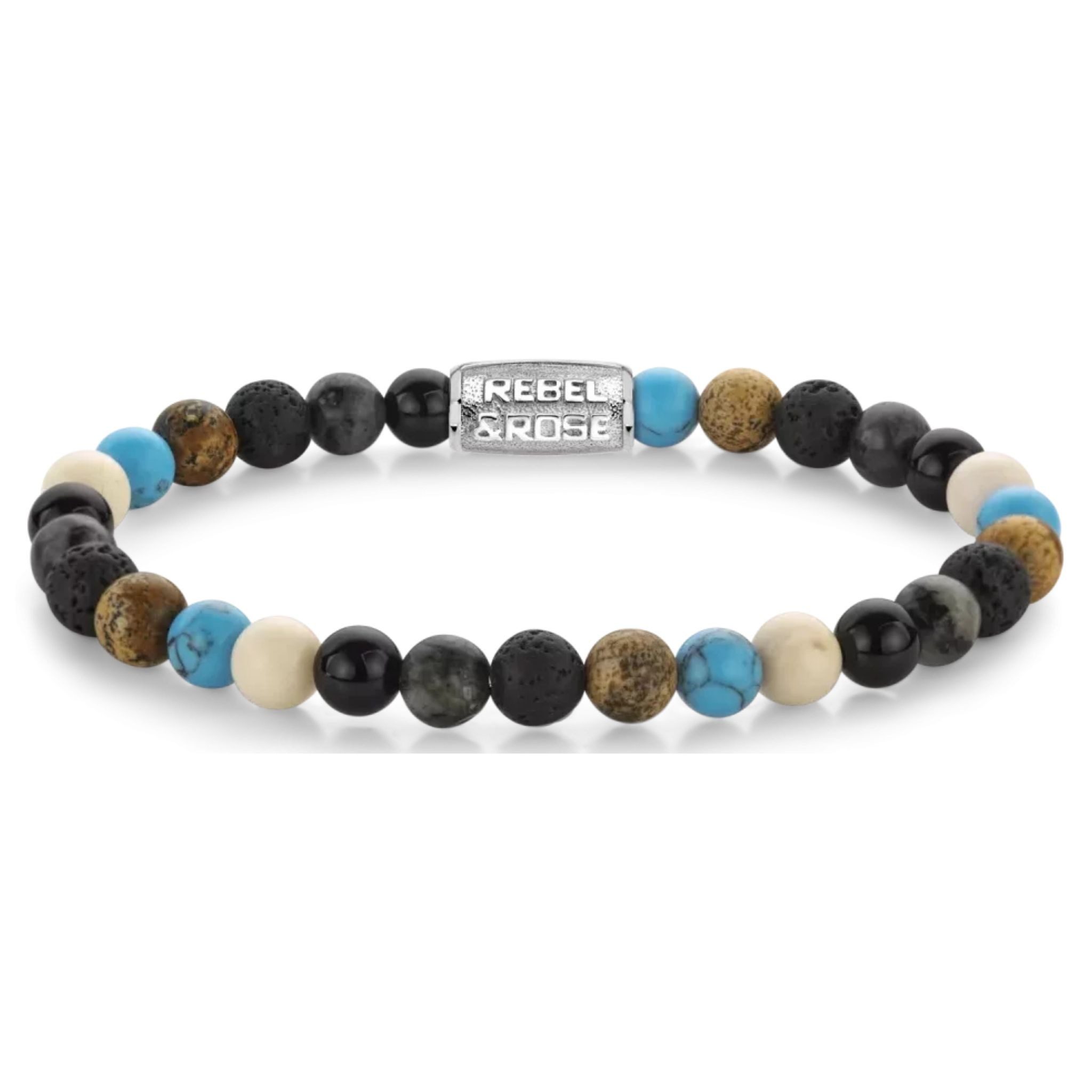 Das Rebel&Rose Armband RR-60131-S-M ist ein markantes Herrenarmband, das durch die Kombination verschiedener Natursteine und einer modernen Verarbeitung überzeugt. Gefertigt aus 6 mm großen Edelsteinen wie Achat, Larvikit, Lavastein, Bild-Jaspis und Turqurenit, begeistert es mit einer spannenden Farbvielfalt von erdigen Braun- und Grautönen bis hin zu dezenten Blauakzenten. Jeder Stein besitzt eine einzigartige Struktur und macht das Armband zu einem echten Unikat. Abgerundet wird das Design durch einen robusten Edelstahlverschluss in Grau, der für sicheren Halt sorgt und das maskuline Gesamtbild perfekt ergänzt. Mit einem Handgelenksumfang von ca. 17,5 cm ist dieses Modell ideal für Herren, die ein vielseitiges Schmuckstück mit Charakter suchen.