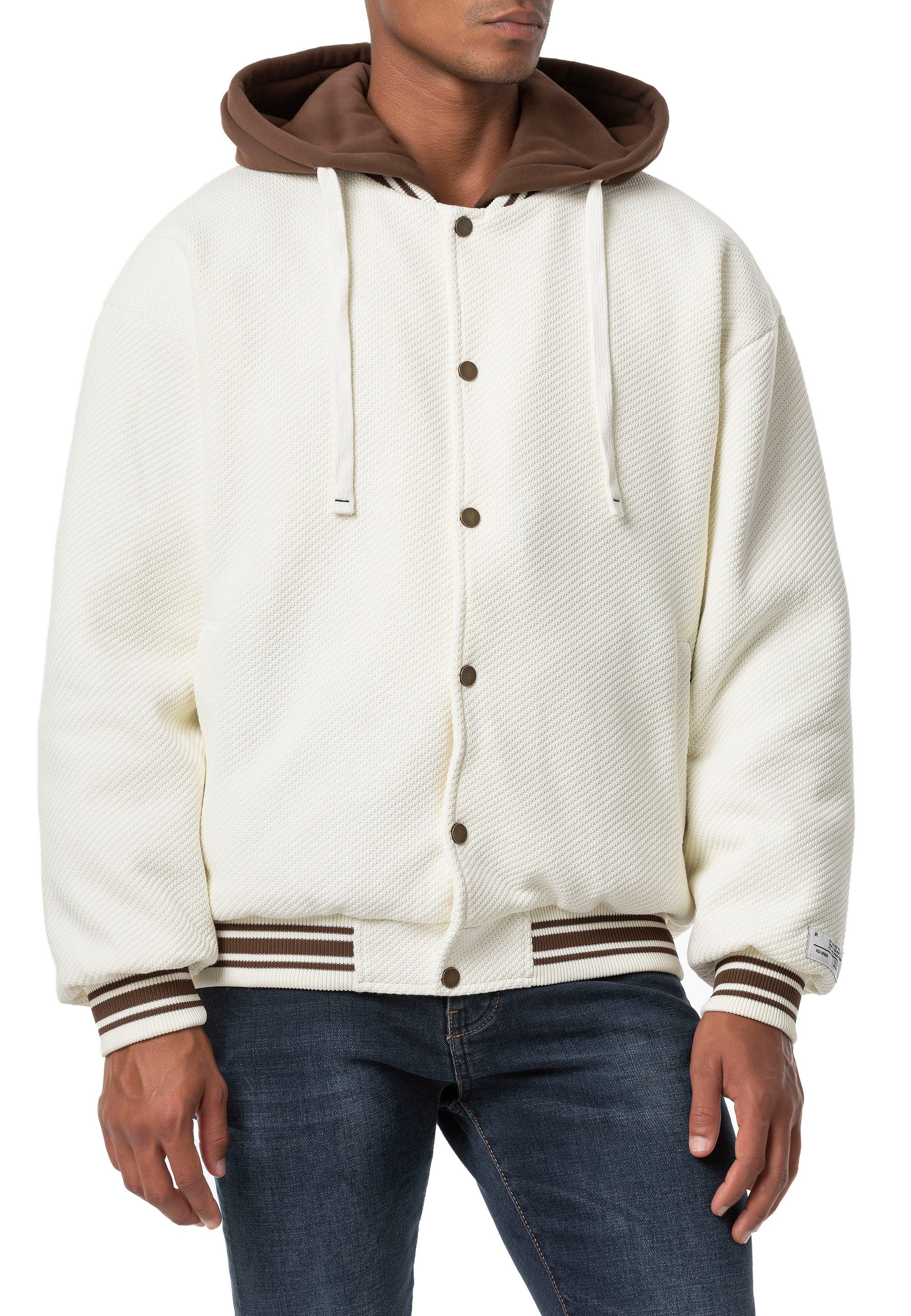 Diese Herren Bomberjacke kombiniert klassische Elemente mit modernen Akzenten, um ein zeitloses und zugleich trendiges Design zu schaffen. Die strukturierte Oberfläche verleiht der Jacke eine edle Optik, während der Hoodie-Einsatz mit Kapuze für einen sportlich-lässigen Lagen-Look sorgt. Perfekt geeignet für wechselhaftes Wetter bietet die Jacke nicht nur Stil, sondern auch Funktionalität. Elastische Rippbündchen an den Ärmeln und am Saum garantieren einen angenehmen Sitz, der die Wärme einschließt. Die kontrastierenden Streifen-Details an den Bündchen und der Verschluss mit hochwertigen Druckknöpfen runden das Design ab. Praktisch und vielseitig, lässt sich die Jacke ideal mit verschiedensten Outfits kombinieren, sei es für den Alltag, Freizeit oder urbane Abenteuer. Ein Must-have für modebewusste Männer, die Wert auf Stil und Komfort legen. Ideal für die Übergangszeit und perfekt für moderne, sportliche Looks.