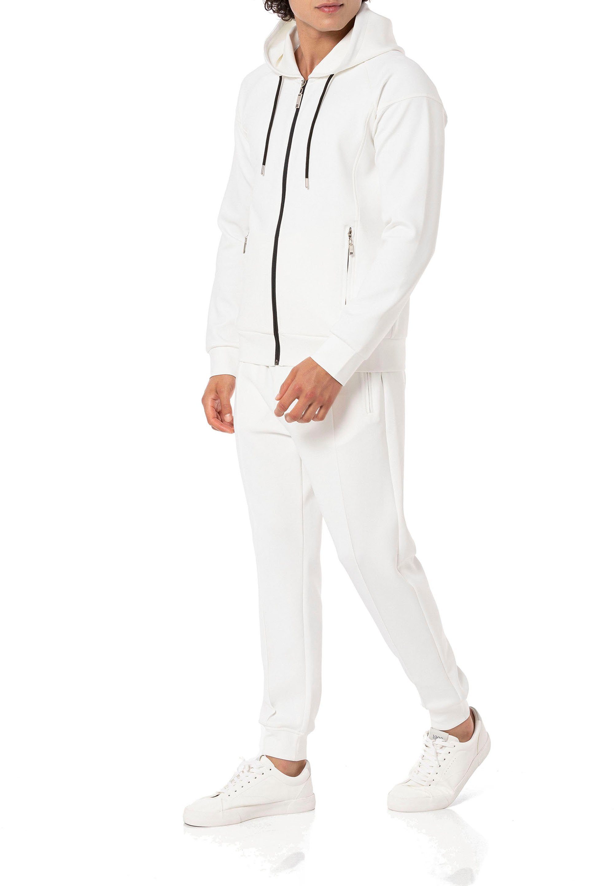 Dieser weiße Herren-Trainingsanzug vereint sportlichen Stil mit maximalem Komfort. Das zweiteilige Set besteht aus einer Kapuzenjacke mit durchgehendem Reißverschluss sowie einer Jogginghose mit elastischem Bund. Die Jacke überzeugt durch eine praktische Kapuze mit Kordelzug und Reißverschlusstaschen, die sicheren Stauraum bieten – perfekt für Schlüssel oder Smartphone. Auch die Hose ist funktional gestaltet, mit elastischen Beinabschlüssen, die für einen modernen Sitz sorgen. Das schlichte, clean gehaltene Design in Weiß verleiht dem Look einen frischen, minimalistischen Touch, der sich mühelos mit Sneakern oder sportlichen Accessoires kombinieren lässt. Ob beim Sport, auf Reisen oder in der Freizeit – dieser Anzug ist ein stilvoller Allrounder mit Wohlfühlfaktor. Das angenehm weiche Material liegt leicht auf der Haut und sorgt dafür, dass du dich den ganzen Tag über wohlfühlst. Ideal für Männer, die Komfort und Stil in einem sportlichen Outfit suchen.