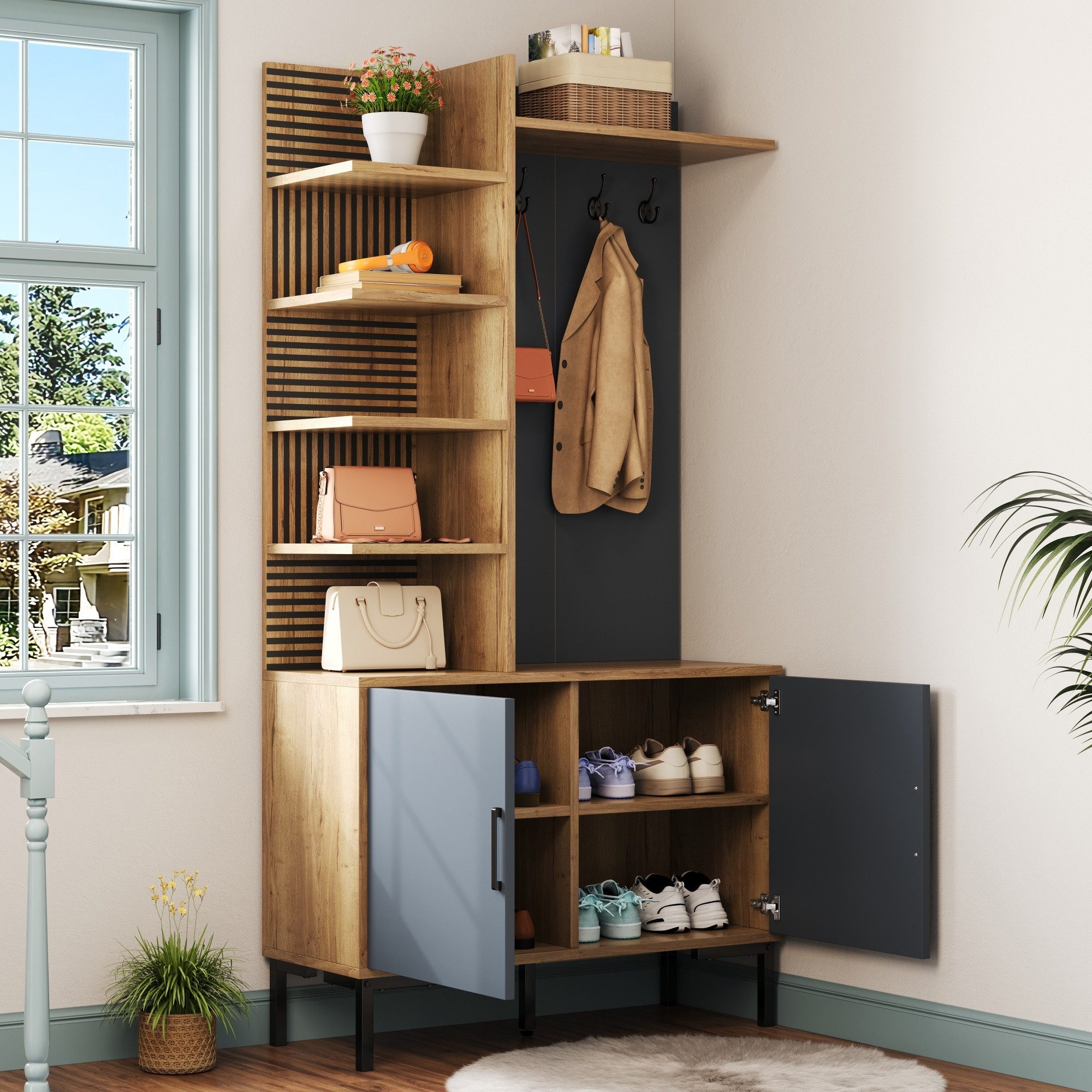 Durchdachte Details machen das Möbelstück besonders praktisch: Mehrere Haken bieten Platz für Jacken, Taschen oder Schals, während die verstellbare untere Ablage Flexibilität für unterschiedlich große Schuhe oder Körbe schafft. Vier seitliche Fächer eröffnen weitere Aufbewahrungsmöglichkeiten und bieten Platz für Dekoration, Bücher oder Alltagsutensilien.