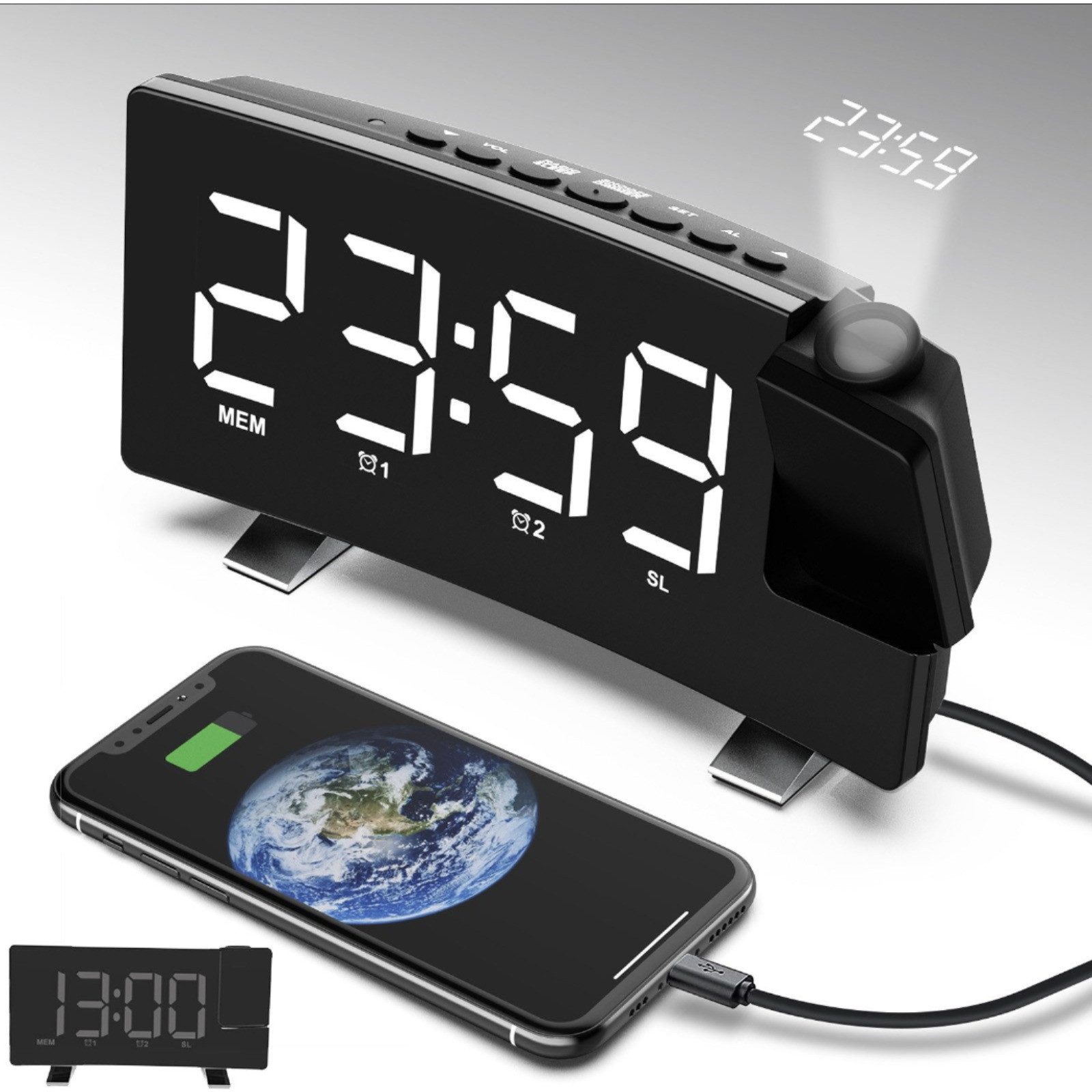 Die HD-Projektion mit einer Reichweite von bis zu 5 m ermöglicht es, die Uhrzeit bequem an Wand oder Decke zu sehen. Der Projektionswinkel kann um 180° angepasst werden, die Helligkeit in zwei Stufen regulierbar – für maximalen Komfort.