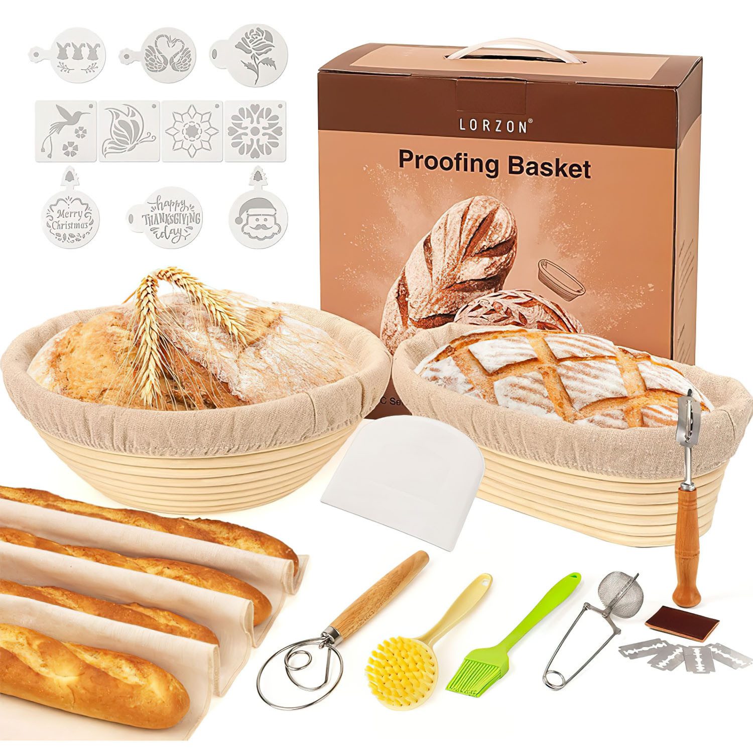 Tauche ein ins Bäckerhandwerk und gestalte Dein Brot ganz individuell. Das Set aus 1 * Blumenform,1 * Runder,Gärkorb für Brot,1 * Ovaler Gärkorb für Brot,1 * 304 Edelstahl-Handgriff-Filter,1 * Weißer Teigschaber,1 * Topfreiniger,1 * Holzgriff-Puderpinsel,1 * Holzgriff-Graviermesser,1 * Grüner integrierter Öl-Pinsel,1 * Gärteigmattehilft Dir dabei, egal ob Baguette, Vollkorn oder Sauerteig.