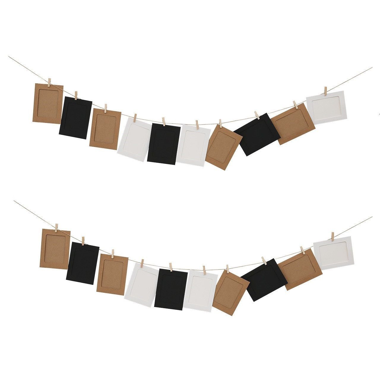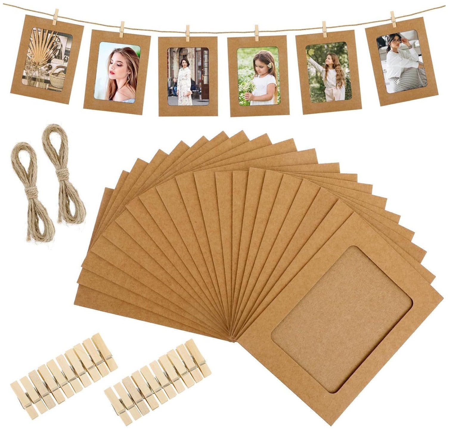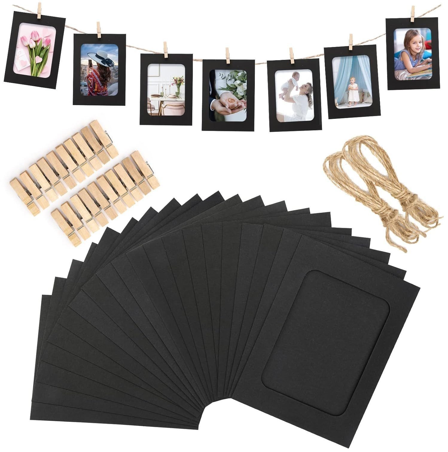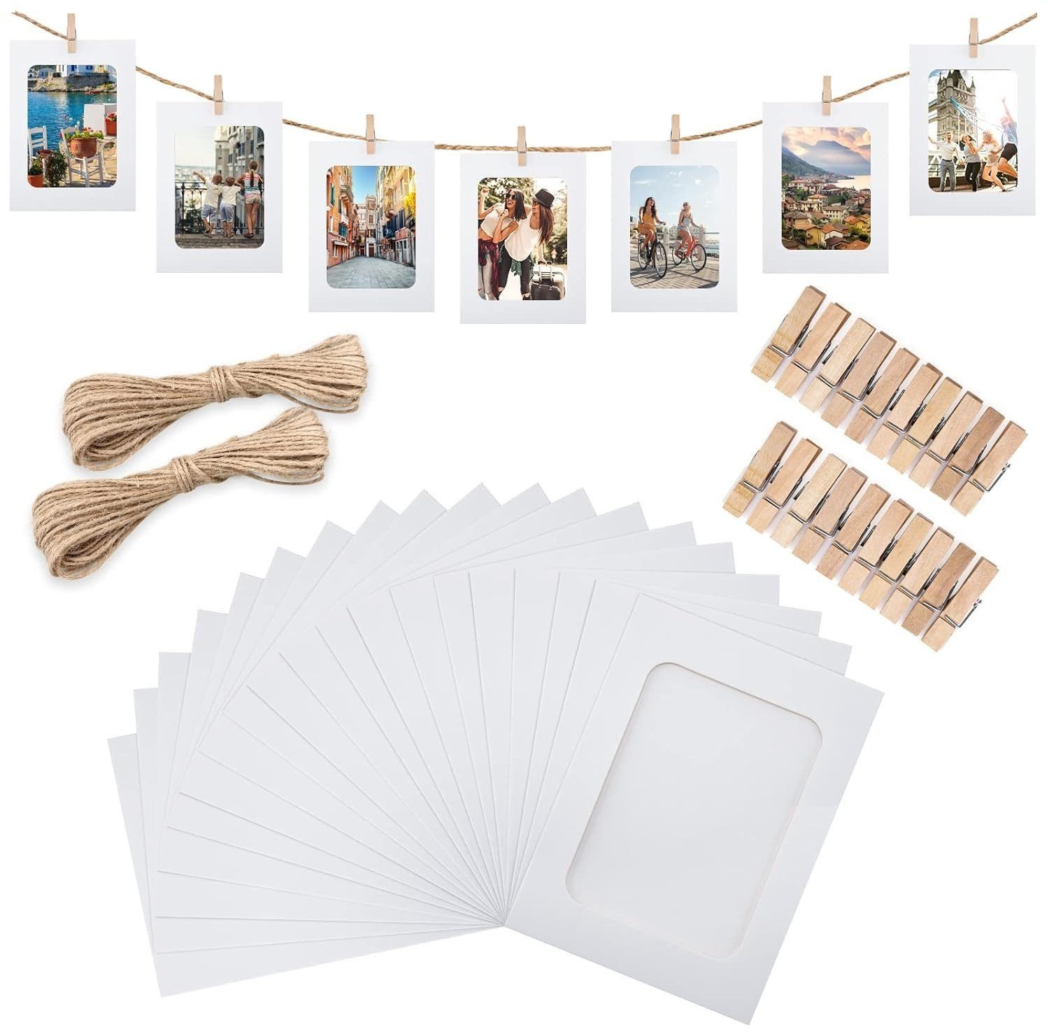 Papier-Bilderrahmen 4 x 6 Zoll, 20 Stück Papier-Fotorahmen, Karton-Bilderrahmen mit Holzclips und Schnüren, DIY-Clip-Fotohalter, Foto-Aufhängeset, Wanddekoration für Zuhause, Party, Büro