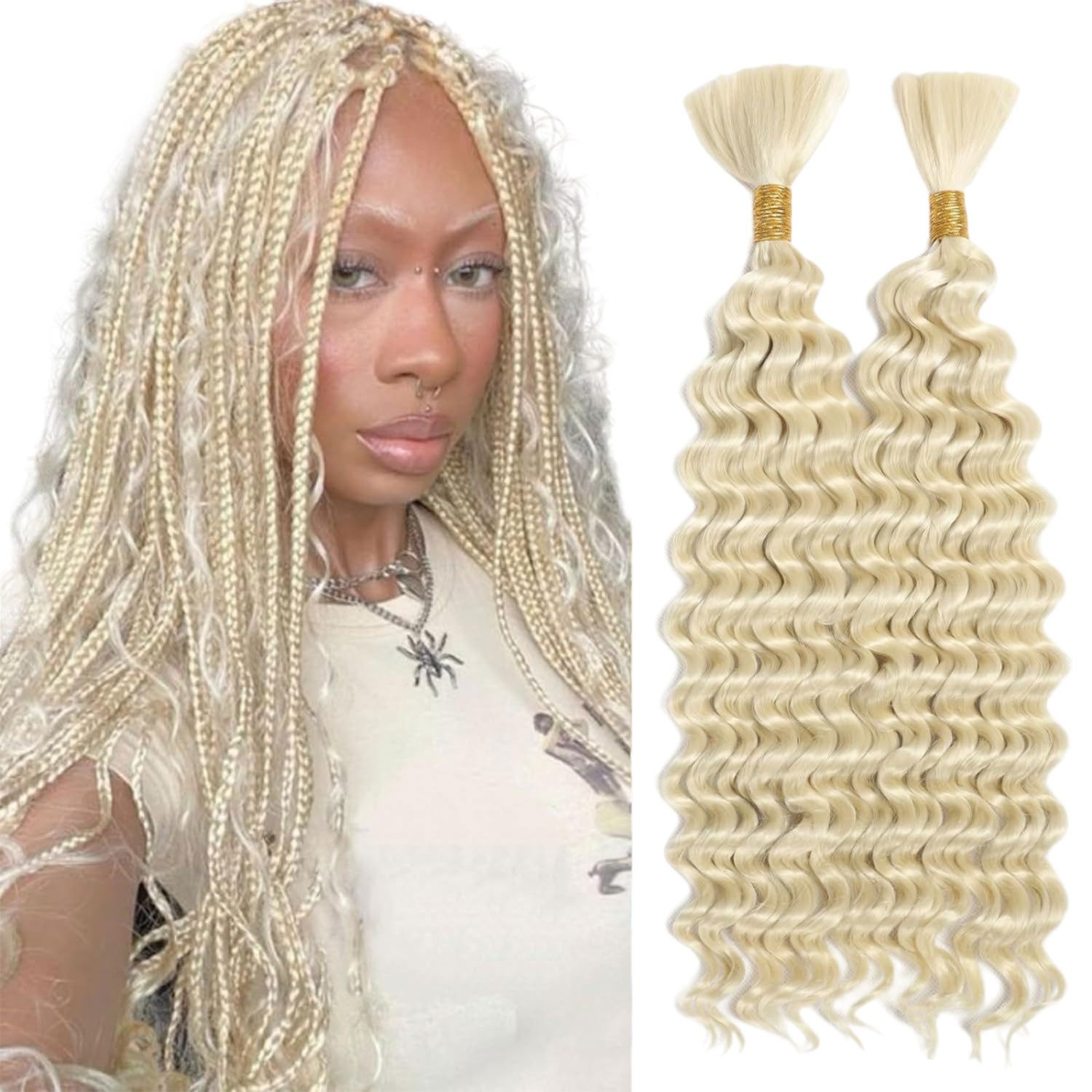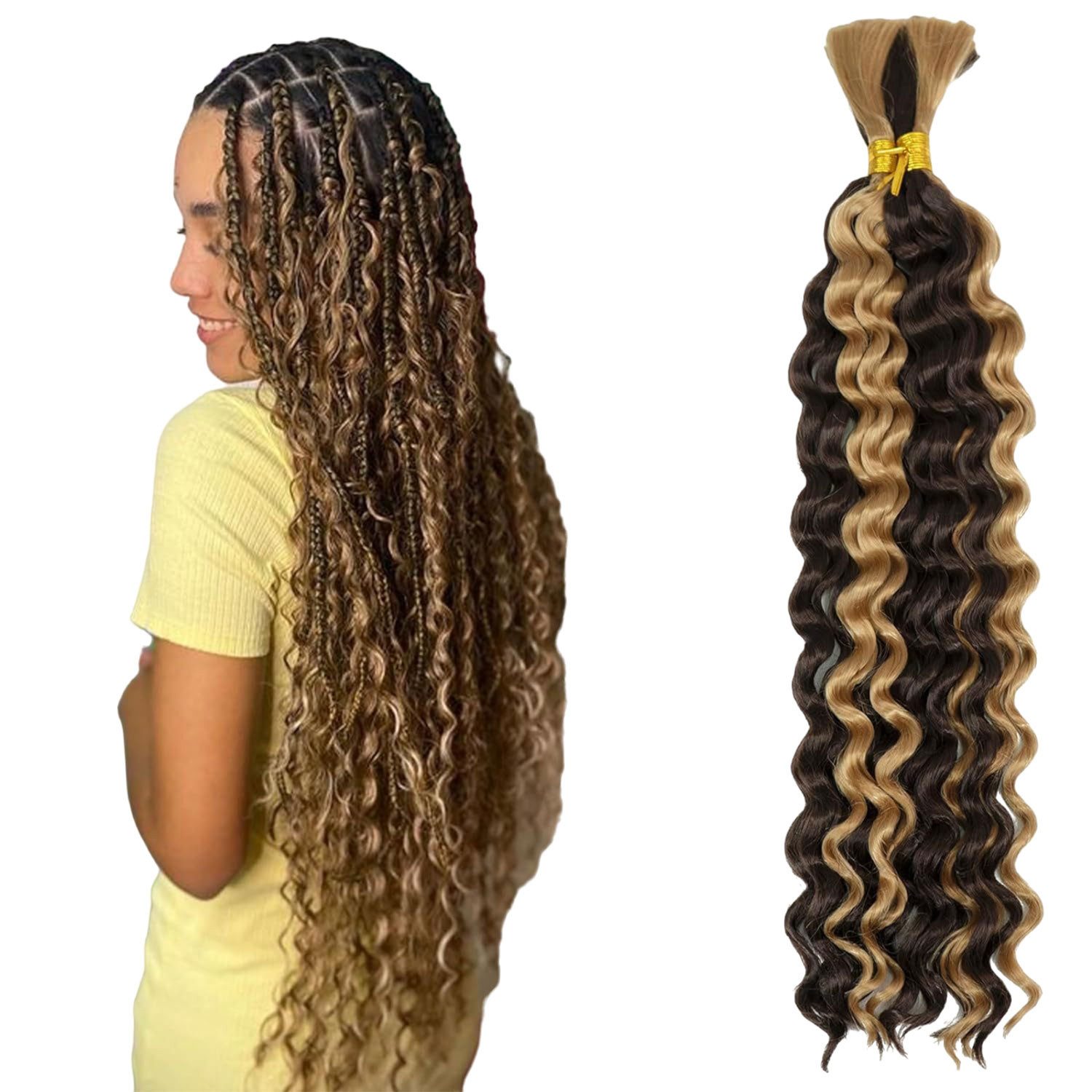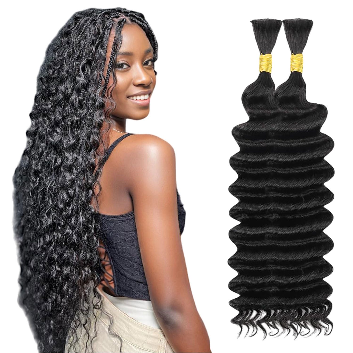 Refttenw Kunsthaar-Extension 46cm Haarverlängerung 2 Bundle Langes Lockiges Haar, Wasserwelliges Echthaar zum Flechten, 2 Bündel, 50 g, 46 cm, unbehandeltes Echthaar, Boho-Zöpfe, Echthaar zum Flechten, keine Schussfäden, natürliche Farbe