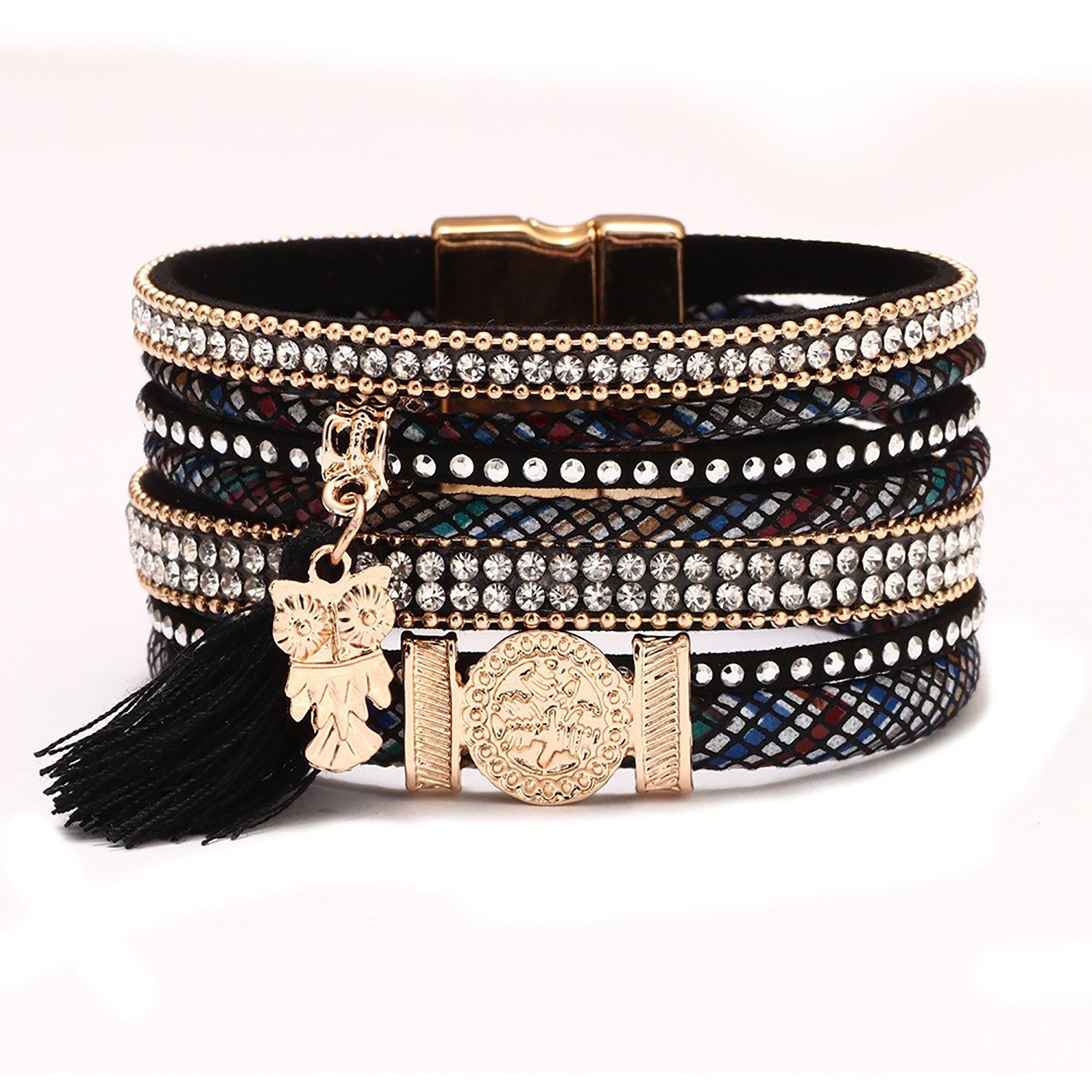 Dieser böhmische magnetische Armreif für Damen ist die perfekte Mischung aus Eleganz und Freiheit und verfügt über ein zartes diamantbesetztes Design mit Eulenverzierung, das für eine einzigartige Persönlichkeit sorgt. Der Magnetverschluss ist so konzipiert, dass er einfach zu tragen ist, was ihn zu einem der beliebtesten Accessoires für modische Frauen macht, egal ob er im Alltag oder zu besonderen Anlässen getragen wird, er kann leicht die Aufmerksamkeit auf sich ziehen.