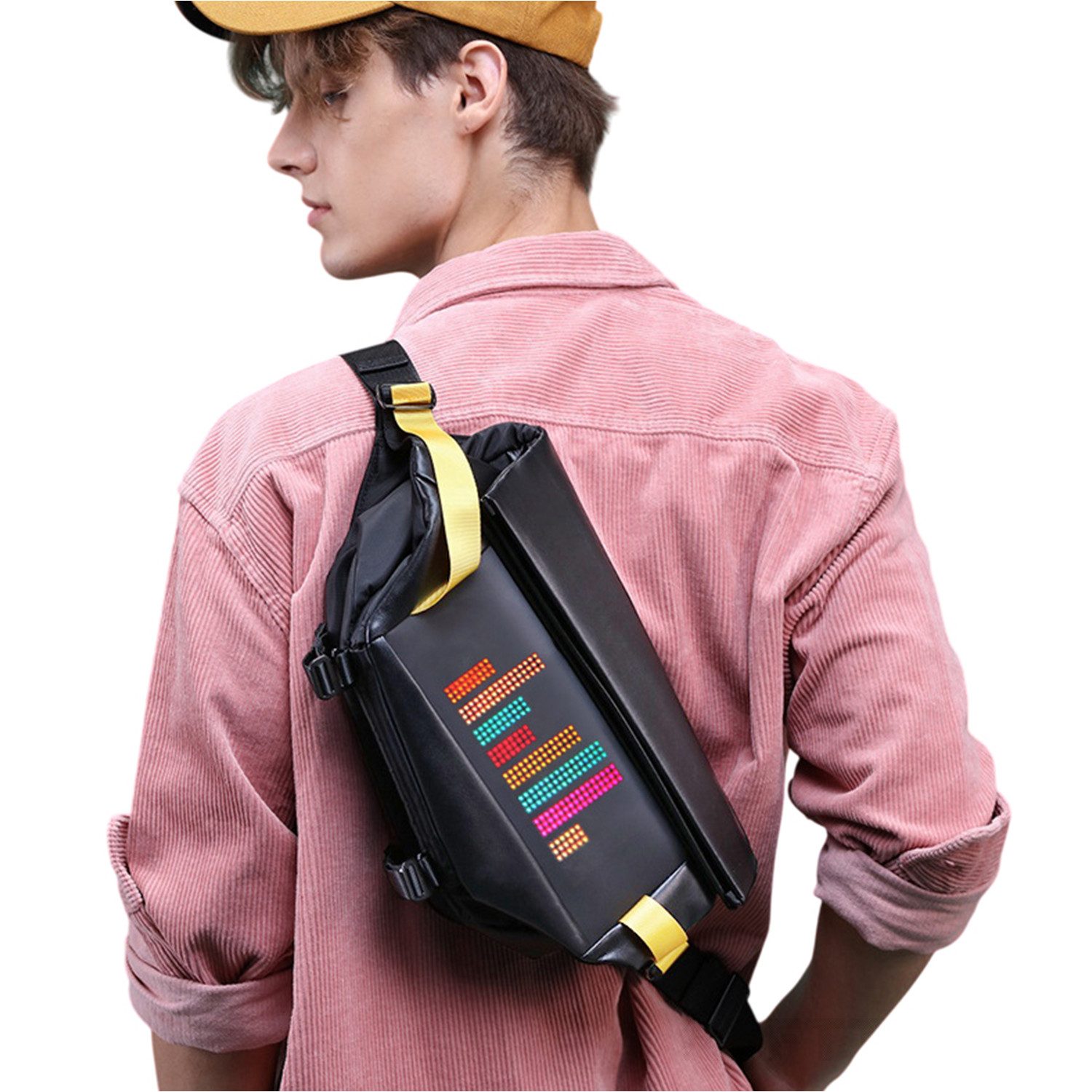 - Fantastisches Design – Mit der integrierten 10x10cm RGB-LED sticht die LED-Umhängetasche aus der Masse. Sie können Pixelkunst, Logos, Slogans oder Animationen entwerfen. Eine stylische Crossbag, die Ihren Geschmack trifft und dennoch Farbe in Ihren urbanen Alltag bringt