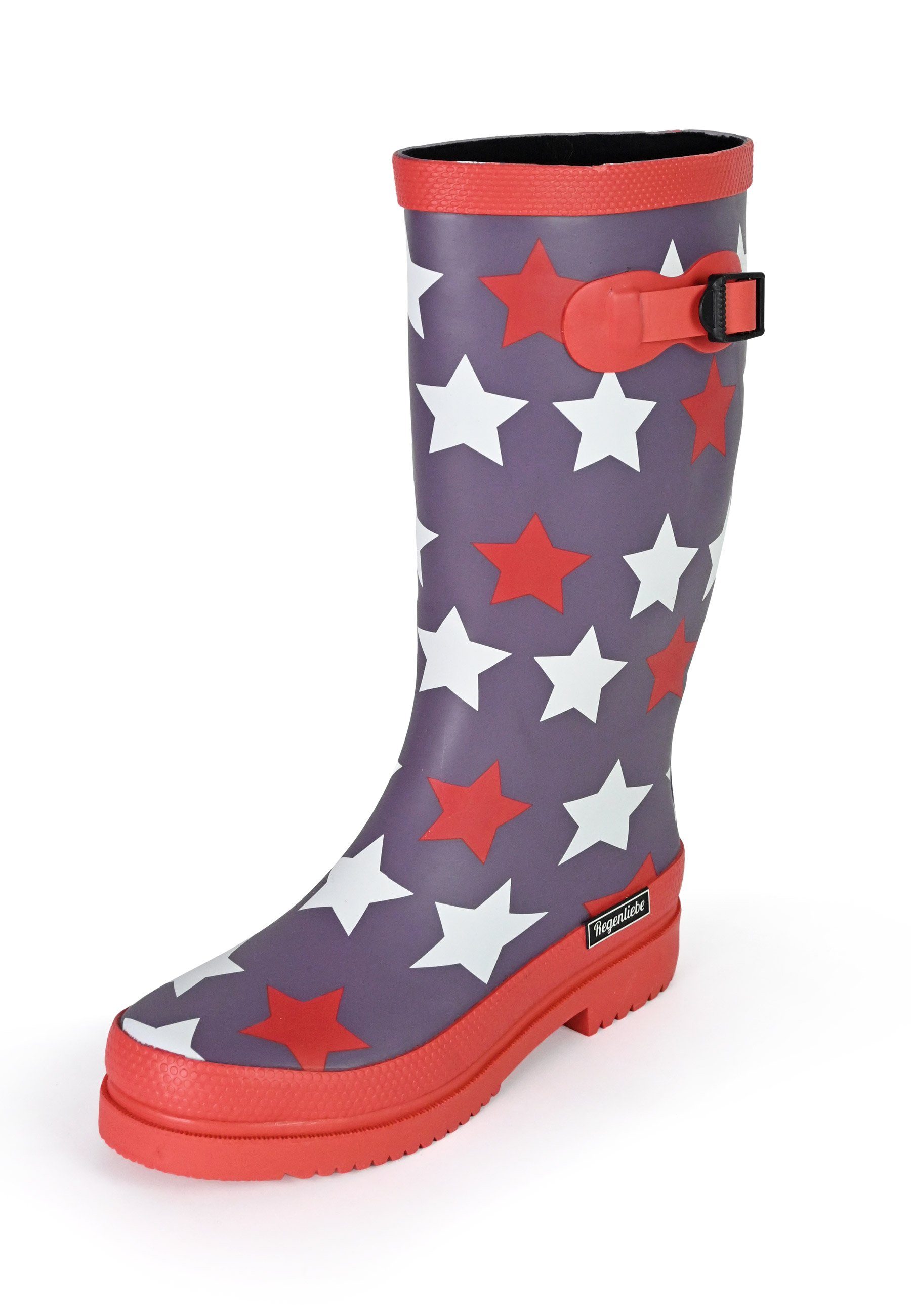 Der hohe Regenliebe Gummistiefel Stars für Damen kombiniert Design und Funktionalität. Das rot-weiße Sternen-Print auf grauem Untergrund macht den Regenstiefel zu einem absoluten Hingucker an regnerischen Tagen. Hält die Füße dank weichem Material und kälteisolierender Einlegesohle zuverlässig warm und trocken. Ein besonderes Highlight ist die rote Sohle und die seitliche Zierschnalle. Der Stiefel überzeugt aber nicht nur mit coolem Print, sondern auch mit hohem Tragekomfort und griffiger rutschfester Laufsohle.