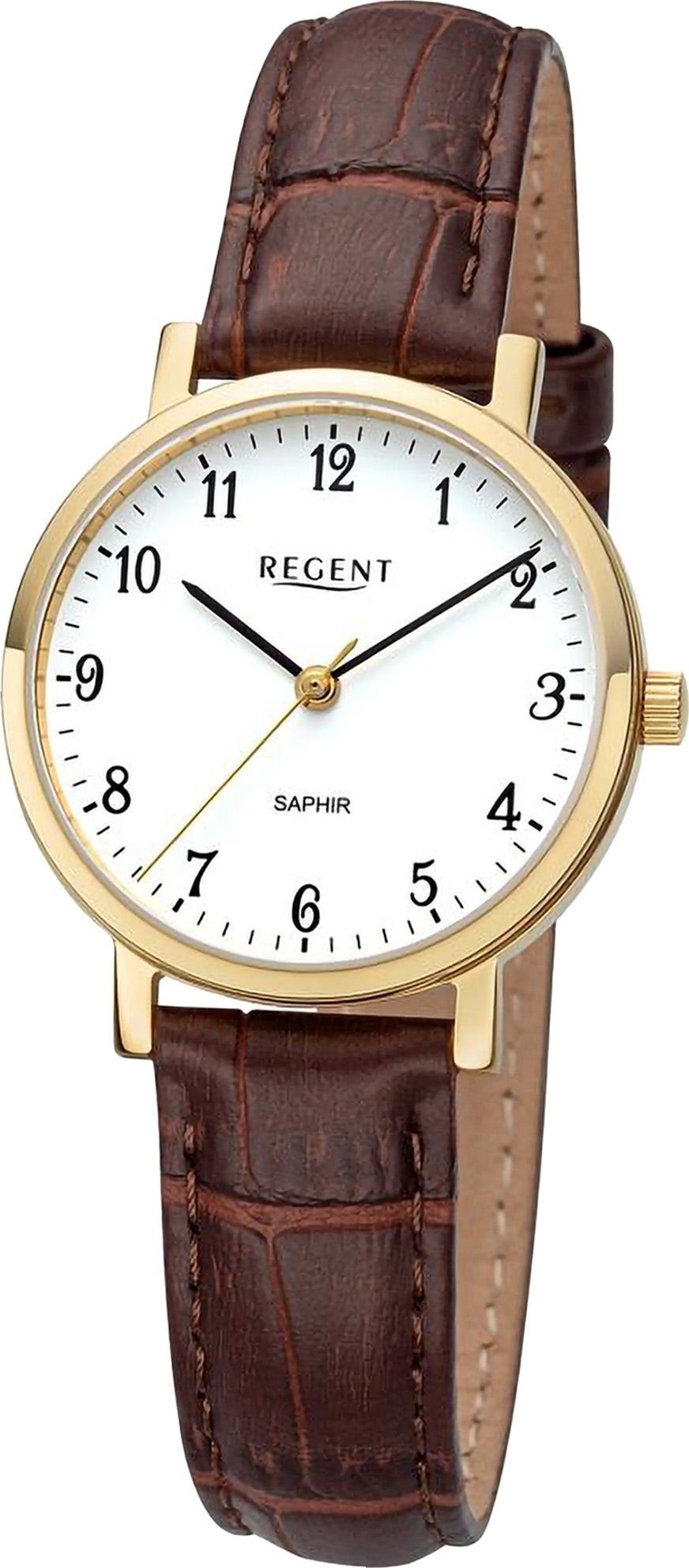 Die Casual Uhr der Marke Regent hat ein schönes Armband aus Leder in braun mit Dornschließe. Eine Uhr aus der Regent Lederarmband Kollektion für Damen in der Gehäusefarbe gold mit Quarzwerk. Die Analoguhr mit Saphirglas hat ein Zifferblatt in der Farbe weiß. Die Form der Uhr ist rund und das Gehäuse ist klein ca. 30mm im Durchmesser.