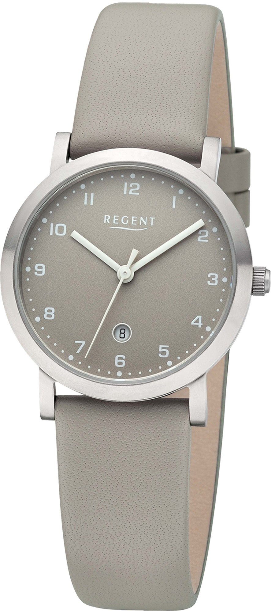 Die Casual Uhr der Marke Regent hat ein schönes Armband aus Leder in grau mit Dornschließe. Eine Uhr aus der Regent Lederarmband Kollektion für Damen in der Gehäusefarbe silber mit Quarzwerk. Die Analoguhr mit Mineralglas hat ein Zifferblatt in der Farbe grau. Die Form der Uhr ist rund und das Gehäuse ist klein ca. 30mm im Durchmesser.