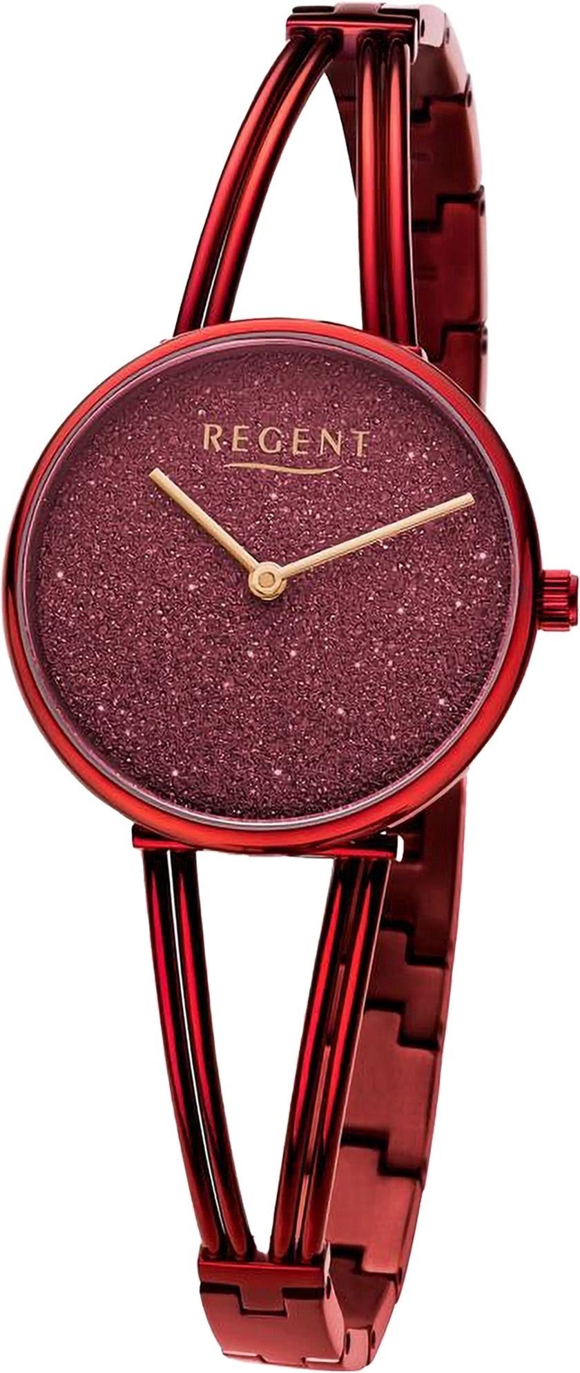 Die Casual Uhr der Marke Regent hat ein schönes Armband aus Metall in rot mit Faltschließe. Eine Uhr aus der Regent Metallarmband Kollektion für Damen in der Gehäusefarbe rot mit Quarzwerk. Die Analoguhr mit Mineralglas hat ein Zifferblatt in der Farbe rot. Die Form der Uhr ist rund und das Gehäuse ist klein ca. 30mm im Durchmesser.
