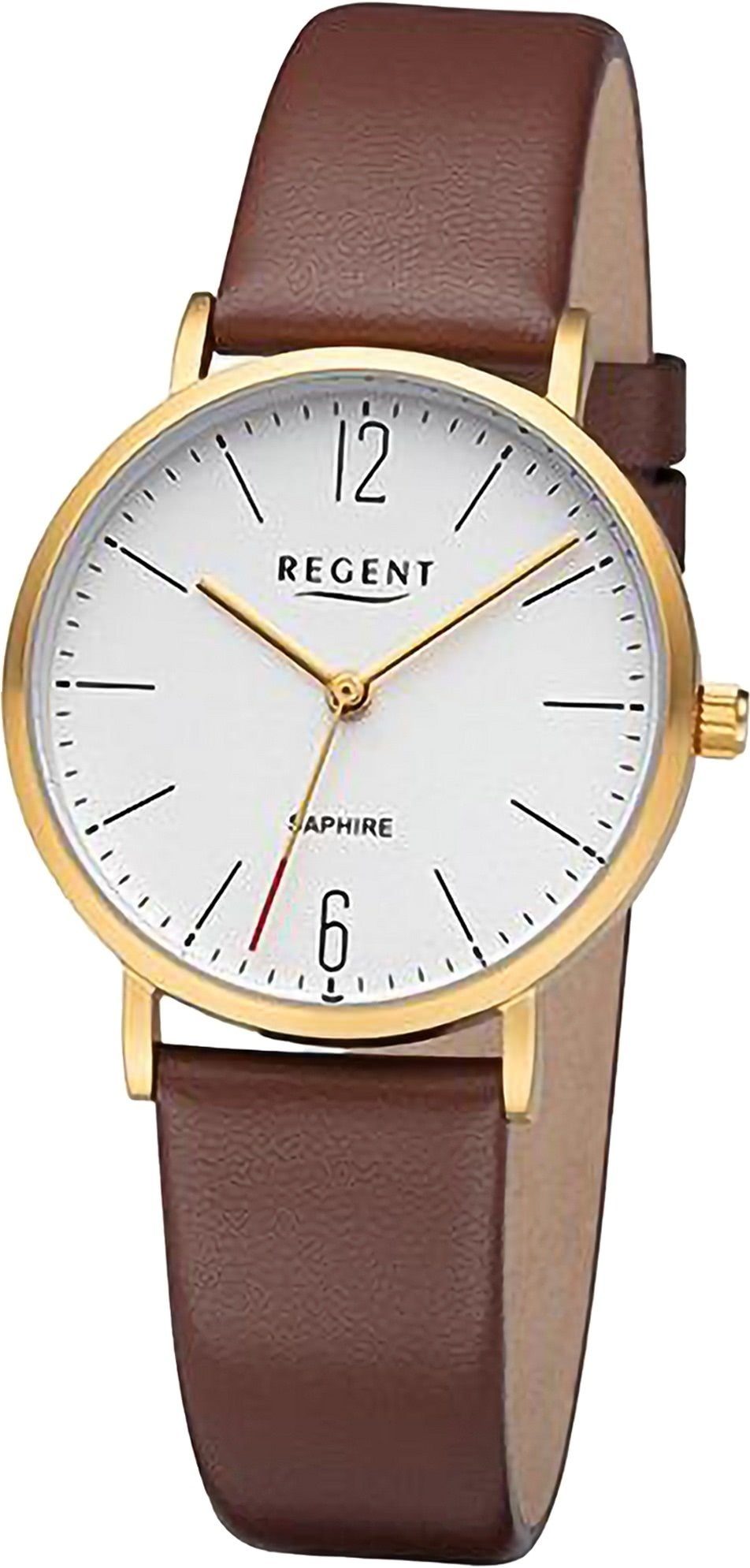 Die Casual Uhr der Marke Regent hat ein schönes Armband aus Leder in braun mit Dornschließe. Eine Uhr aus der Regent Lederarmband Kollektion für Damen in der Gehäusefarbe gold mit Quarzwerk. Die Analoguhr mit Saphirglas hat ein Zifferblatt in der Farbe weiß. Die Form der Uhr ist rund und das Gehäuse ist mittel ca. 32mm im Durchmesser.