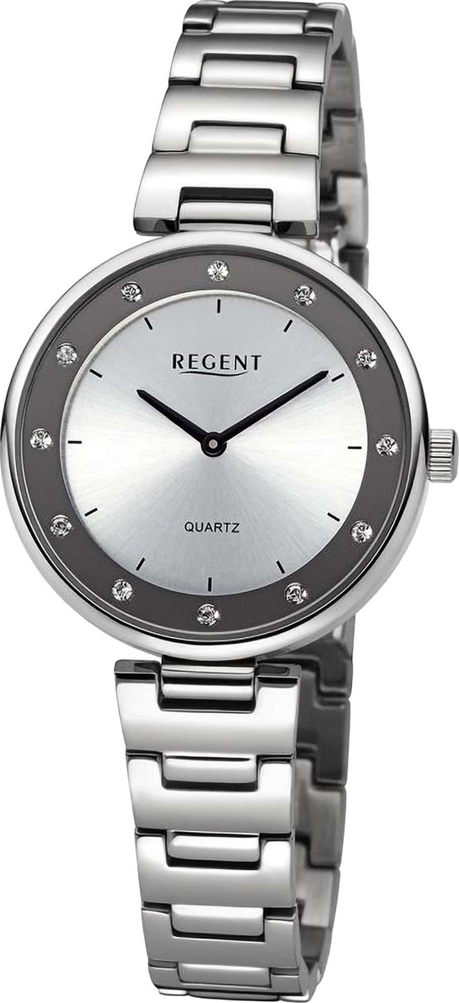 Die Casual Uhr der Marke Regent hat ein schönes Armband aus Metall in silber mit Faltschließe. Eine Uhr aus der Regent Metallarmband Kollektion für Damen in der Gehäusefarbe silber mit Quarzwerk. Die Analoguhr mit Mineralglas hat ein Zifferblatt in der Farbe silber dunkelgrau. Die Form der Uhr ist rund und das Gehäuse ist mittel ca. 34mm im Durchmesser.
