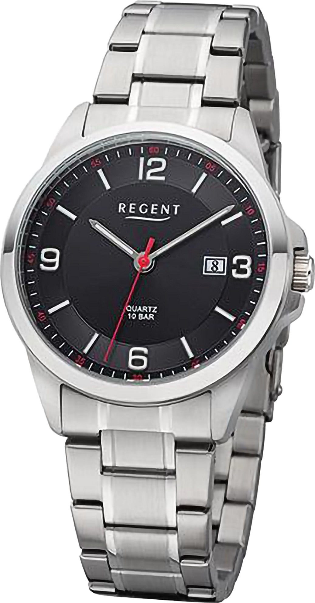 Die Casual Uhr der Marke Regent hat ein schönes Armband aus Metall in silber mit Faltschließe. Eine Uhr aus der Regent Metallarmband Kollektion für Herren in der Gehäusefarbe silber mit Quarzwerk. Die Analoguhr mit Mineralglas hat ein Zifferblatt in der Farbe schwarz. Die Form der Uhr ist rund und das Gehäuse ist mittel ca. 39mm im Durchmesser.