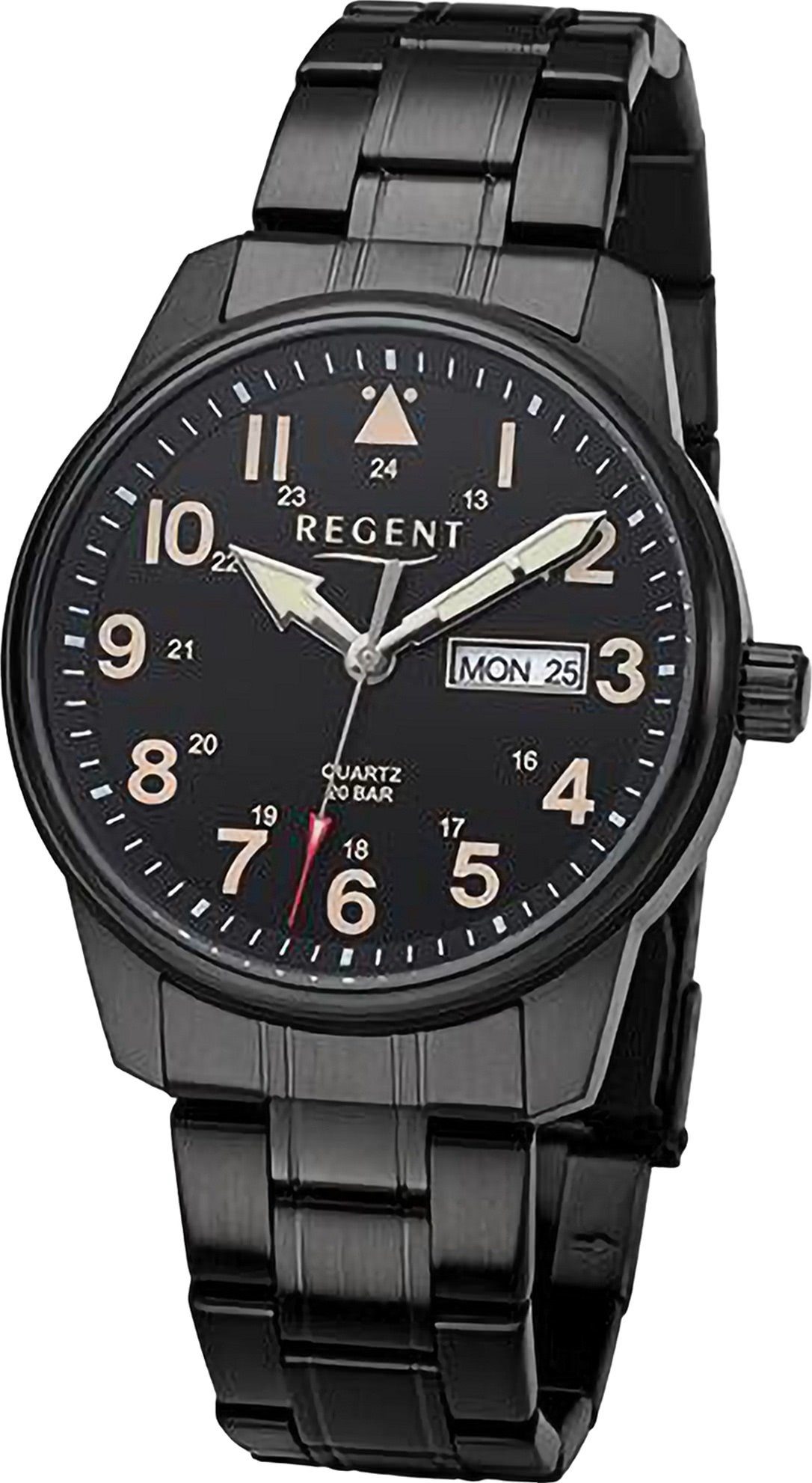 Die Casual Uhr der Marke Regent hat ein schönes Armband aus Metall in schwarz mit Faltschließe. Eine Uhr aus der Regent Metallarmband Kollektion für Herren in der Gehäusefarbe schwarz mit Quarzwerk. Die Analoguhr mit Mineralglas hat ein Zifferblatt in der Farbe schwarz. Die Form der Uhr ist rund und das Gehäuse ist groß ca. 40,5mm im Durchmesser.