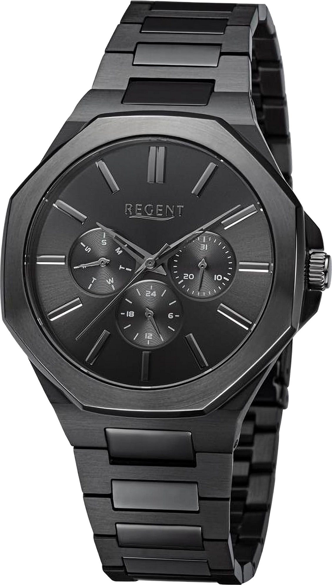 Die Casual Uhr der Marke Regent hat ein schönes Armband aus Metall in schwarz mit Faltschließe. Eine Uhr aus der Regent Metallarmband Kollektion für Herren in der Gehäusefarbe schwarz mit Quarzwerk. Die Analoguhr mit Mineralglas hat ein Zifferblatt in der Farbe schwarz. Die Form der Uhr ist rund und das Gehäuse ist groß ca. 42mm im Durchmesser.