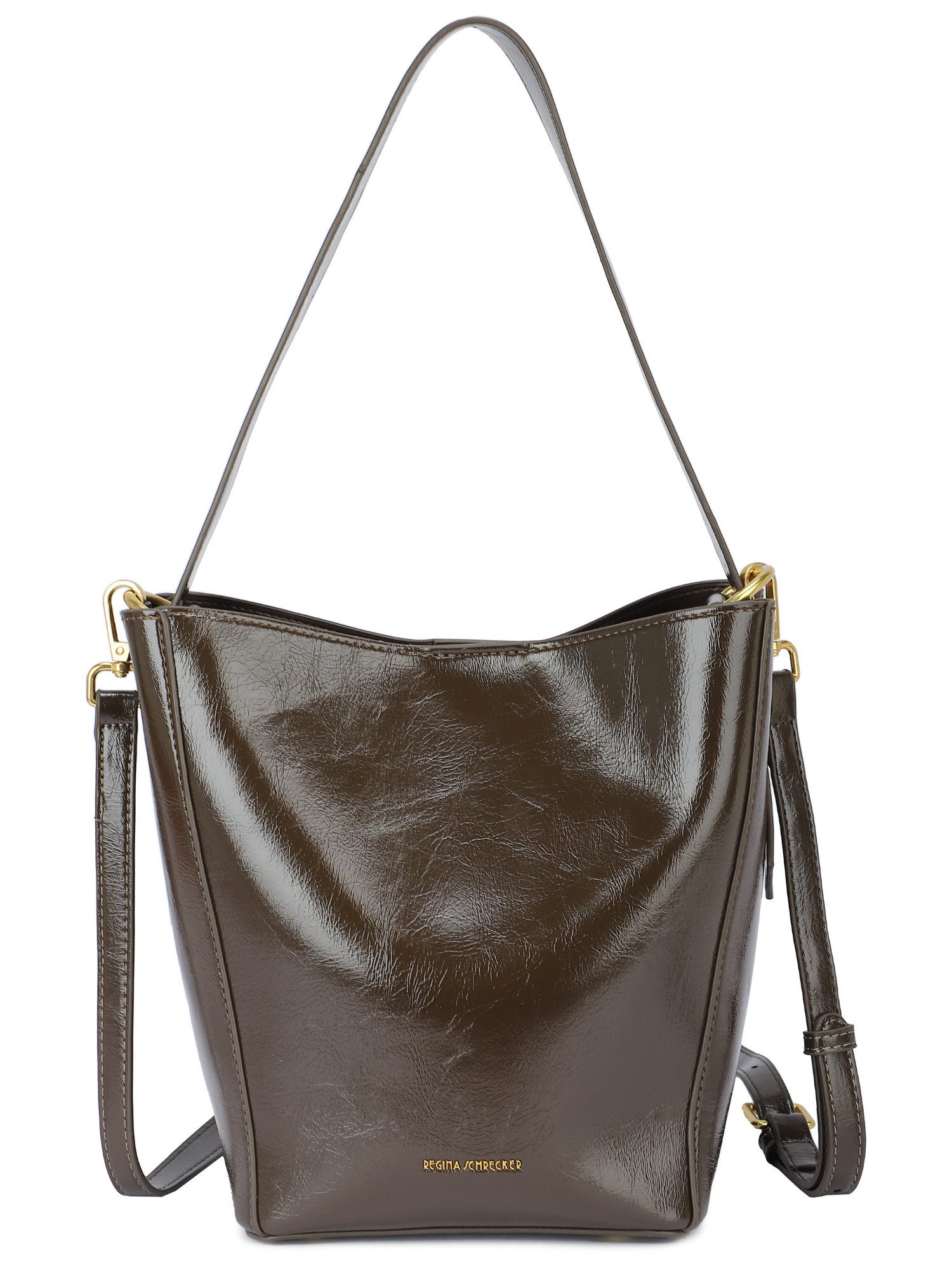 Die Regina Schrecker Bucket Bag vereint elegantes Design mit höchster Funktionalität. Aus hochwertigem Kunstleder gefertigt, überzeugt diese Tasche durch ihre glänzende Oberfläche und präzise Verarbeitung. Mit den kompakten Maßen 23 x 28 x 17 cm (Tiefe: 13 cm) bietet sie ausreichend Stauraum für Ihre täglichen Essentials.
