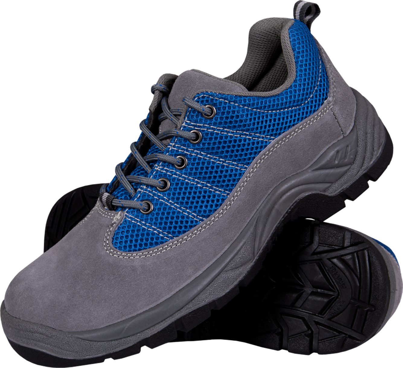 XREIS Sicherheitsschuhe aus Rindsveloursleder in grauer Farbe kombiniert mit blauem Mesh im oberen Teil des Schuhs Halbschuhtyp, bis vor den Knöchel reichend Sohle aus doppeltem Polyurethan, ölbeständig, antielektrostatisch Stoßdämpfung unter der Ferse Widerstandsfähigkeit des Bodens gegen 1100N Durchstich Stahlkappe widerstandsfähig gegen 200 J Stoß und 15 kN Druck Stahleinlage in der Sohle ideal für Männer und Frauen Mesh erhöht die Atmungsaktivität des Schuhs, so dass der Fuß atmen kann Kategorie S1P SRA erfüllen die Anforderungen der Normen EN20345 und EN20344. Empfohlen für Branchen: -Logistik einschließlich Transport und Umschlag (Lagerarbeiten) -Bau und Renovierungsarbeiten/Montage- und Installationsarbeiten/Straßenbau -Automobilindustrie einschließlich Bau, Mechanik und Reparatur von Fahrzeugen und Lackierung -Landwirtschaft/Gartenbau/Forstwirtschaft/Jagd/Fischerei -Handwerk einschließlich Herstellung und Verarbeitung von Glas, Keramik, Holz und Druckarbeiten