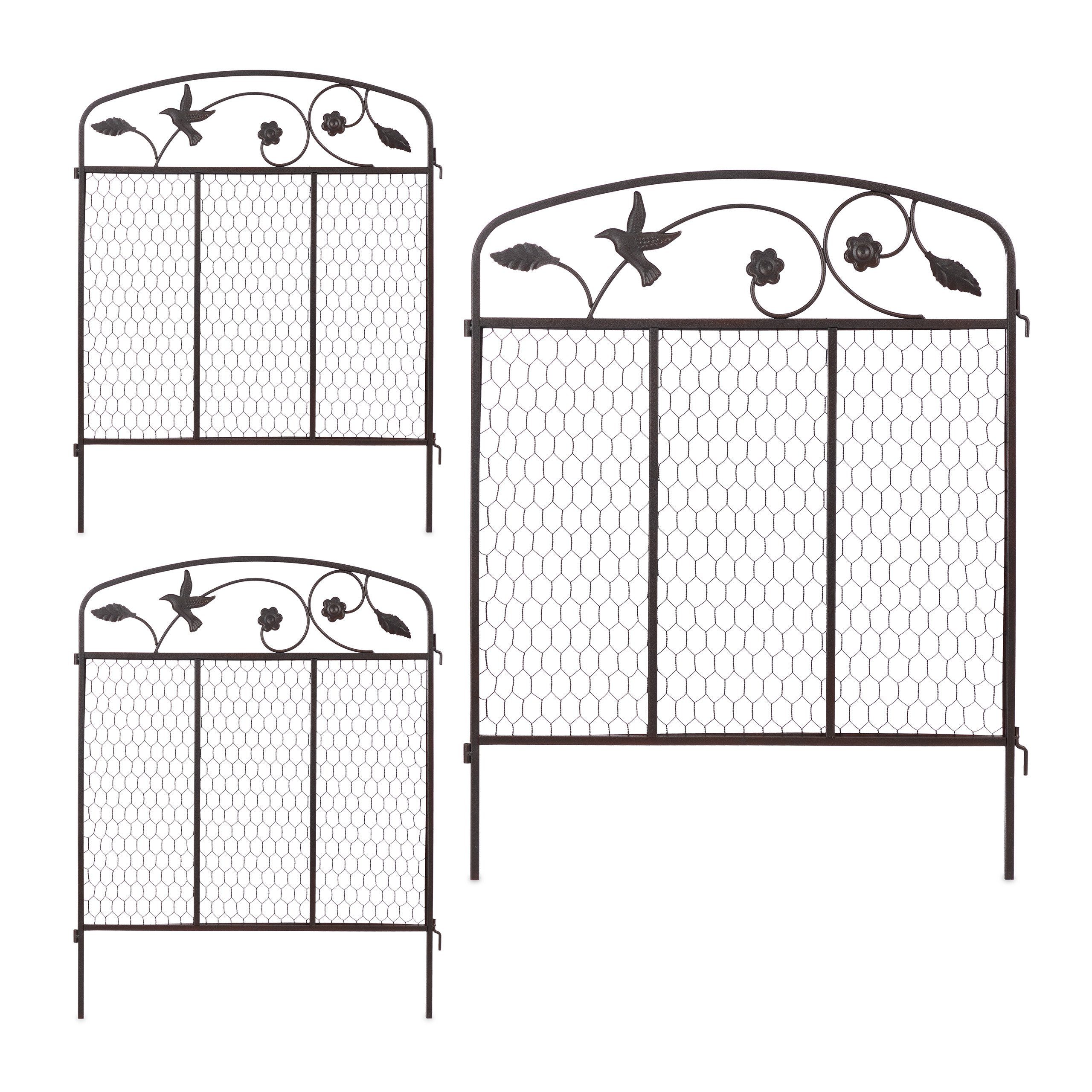 Mit der dekorativen Beeteinfassung gestalten und verschönern Sie Ihren Garten schnell und einfach. Der 3-teilige Zierzaun verfügt über Erdspieße, welche einfach in den Boden gedrückt werden. Die Verbindungen der Zaunelemente sind flexibel, sodass die Beetumrandung individuell gesteckt werden kann. Der hohe Blumenbeetzaun ist mit Maschendraht ausgestattet, welches rankenden Pflanzen Halt gibt. Der obere Teil des Metallzauns ist mit einem kunstvollen Muster aus Blumen und Vögeln verziert.