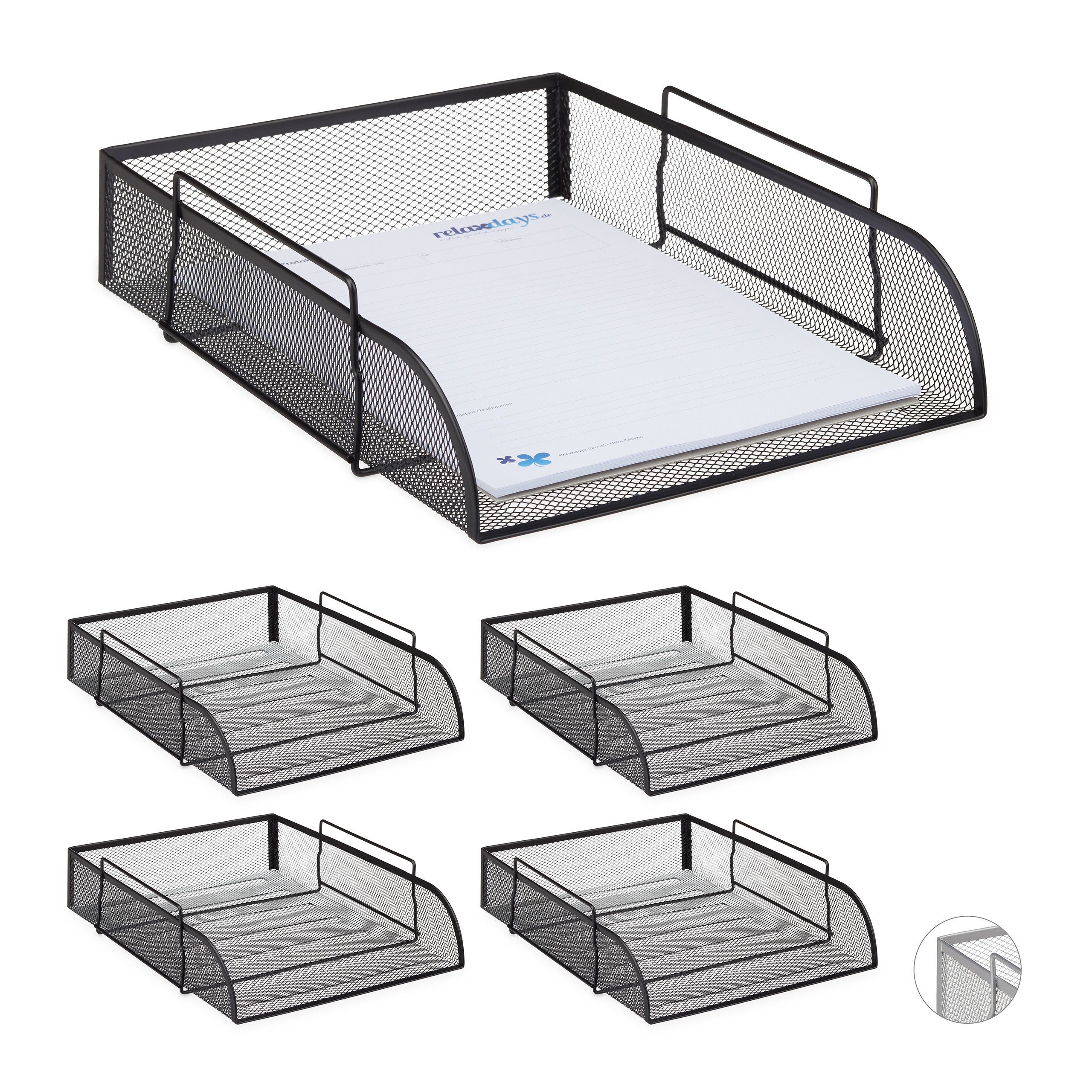 Die praktische Dokumentenablage aus Metall stapelt wichtige Unterlagen, Briefe und Rechnungen platzsparend übereinander. Das Ablagefach eignet sich für Papier im DIN A4 Format. Die tiefe Briefablage besteht aus einem dünnem Drahtgeflecht und bildet so die angesagte Mesh-Optik, welche auf jeden Schreibtisch passt. Durch die Wellen auf der Ablagefläche