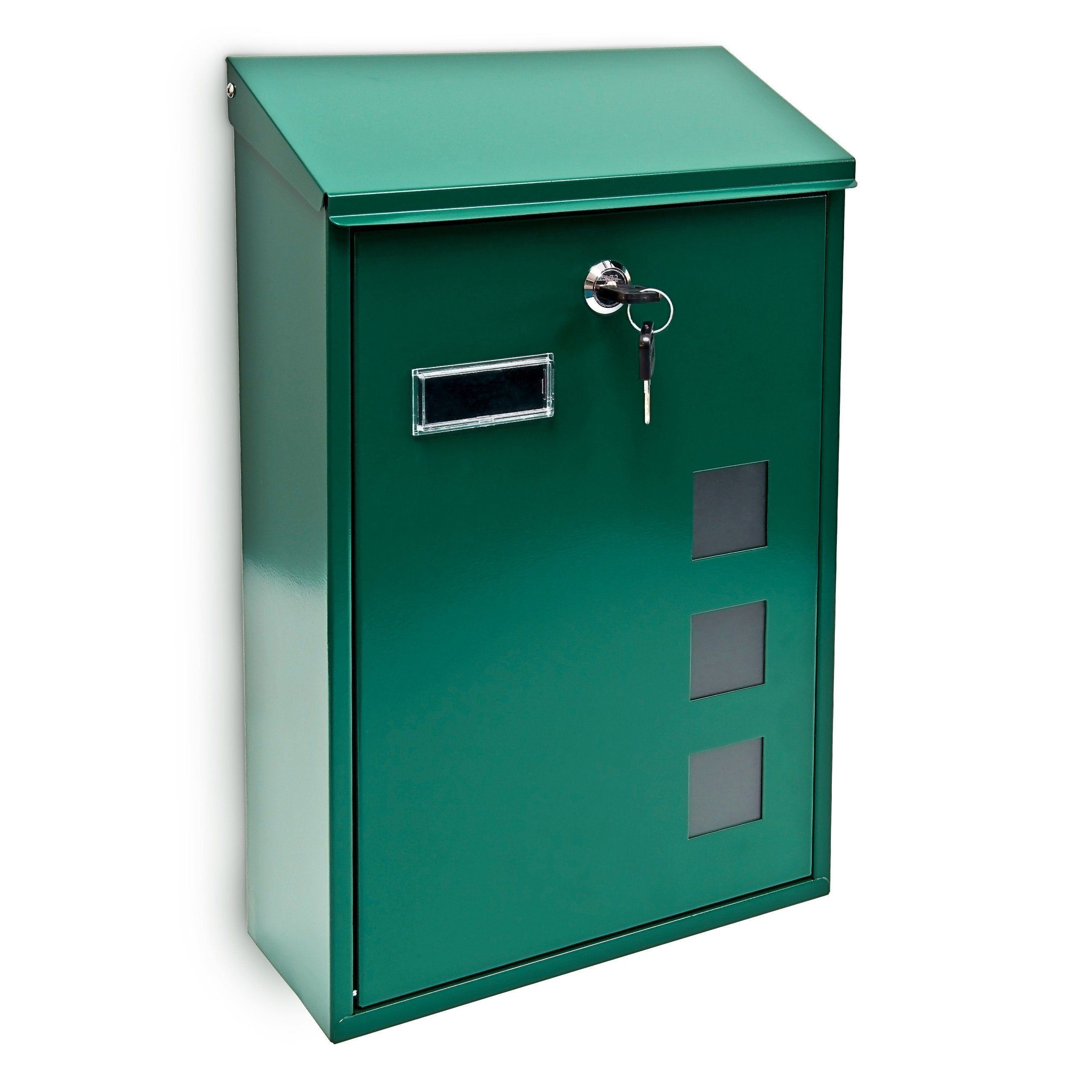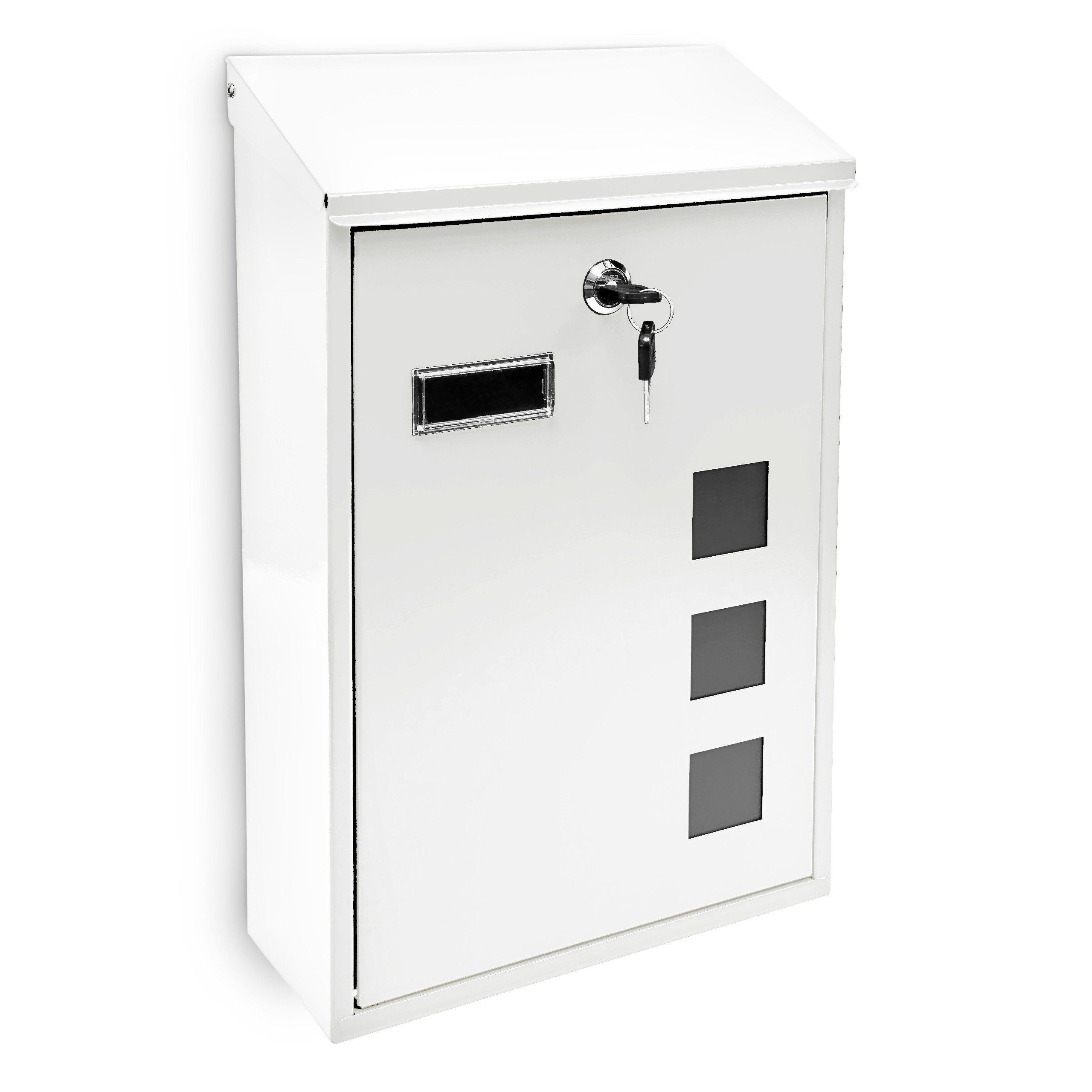 Dieser Briefkasten ist ein dezenter, aber moderner Blickfang an Ihrer Hauswand. Durch seine akzentuiert minimalistische Gestaltung passt er sich dem Umfeld an, ohne jedoch unterzugehen. So können Sie mit wenig Aufwand Akzente an Ihrer eigenen Hauswand setzen. Der Einwurfschlitz des Briefkastens befindet sich unter der Dachklappe. Zwei Schlüssel werden mitgeliefert, mit denen Sie den Briefkasten einfach öffnen und sicher wieder verschließen können. Sein minimalistisches Design wird durch drei quadratische Kunststoff-Fenster betont und aufgelockert.